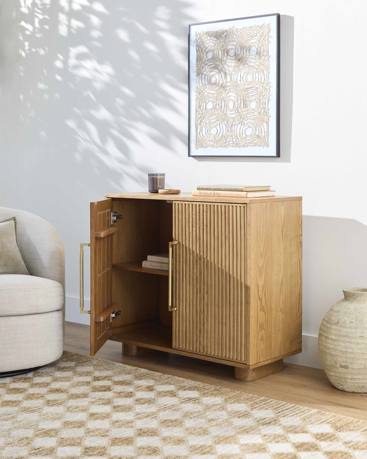• Close-up of Truls 3D Checkered Washable Rug - Biscotti. Beige, cream, and peach checkered pattern. Machine woven polyester rug. Design-Rectangle-5373 Living room scene with a biscotti Truls 3D Checkered Washable Rug, cream sofa, wood chair, and light neutral decor. Roomscene-Rectangle