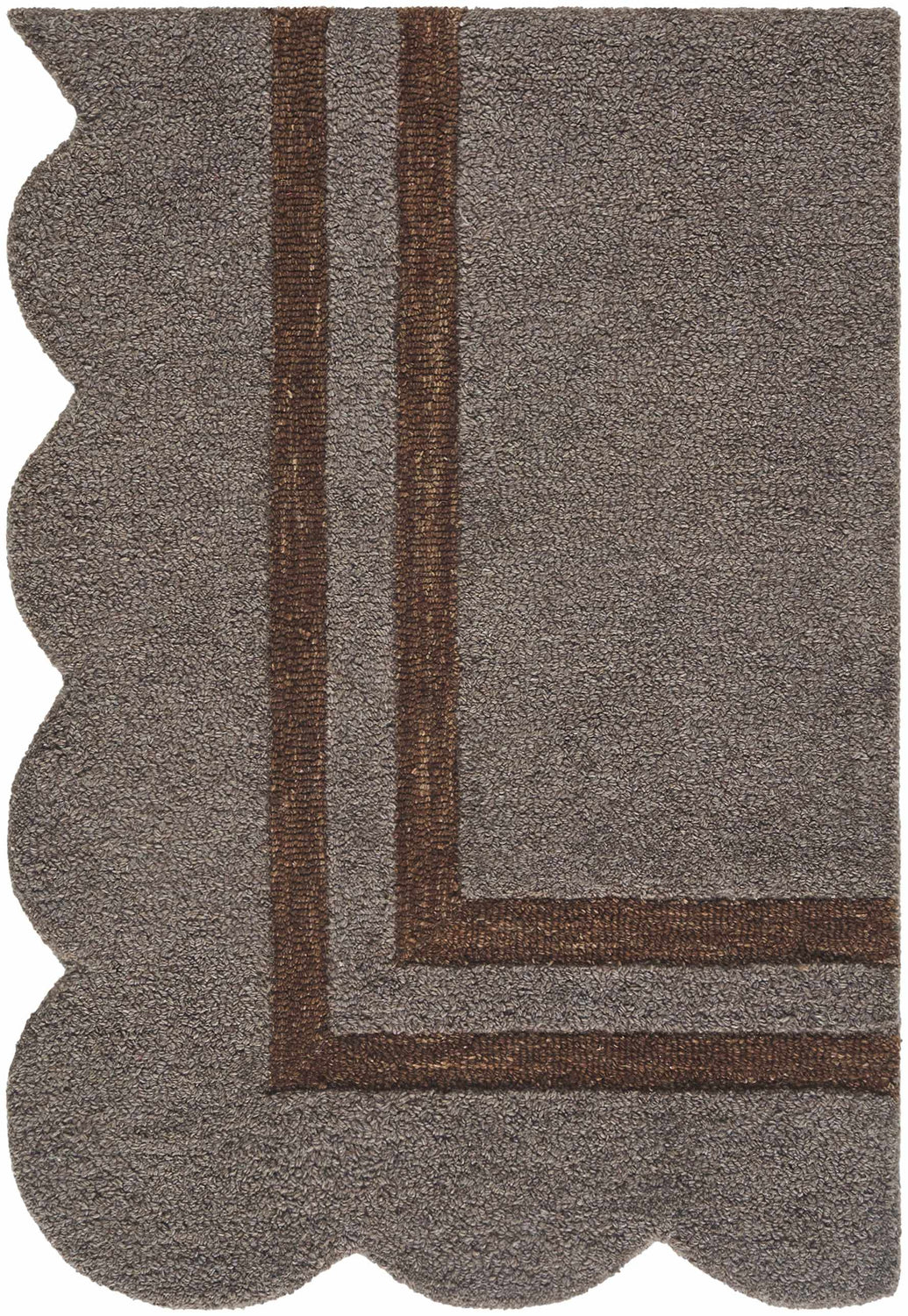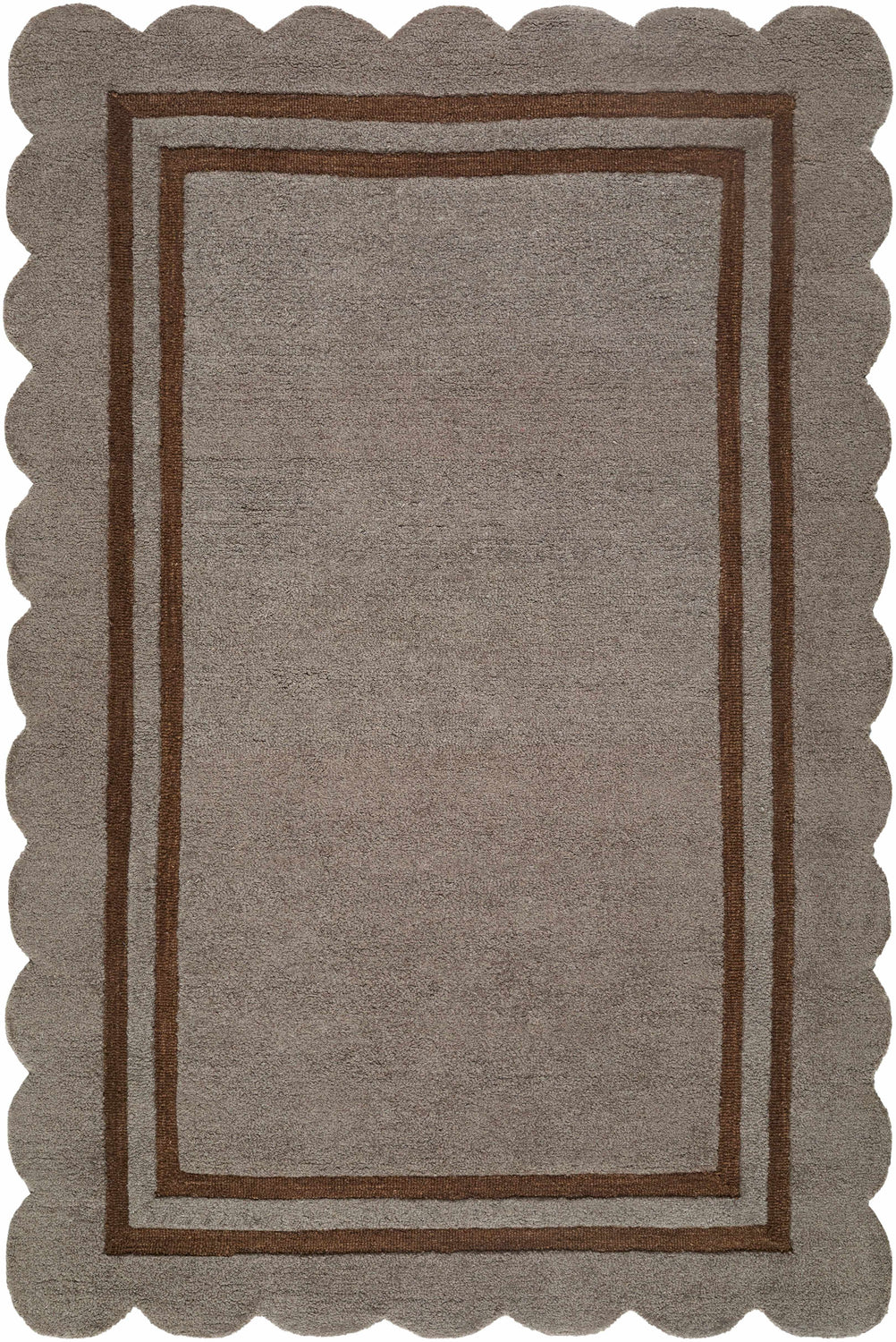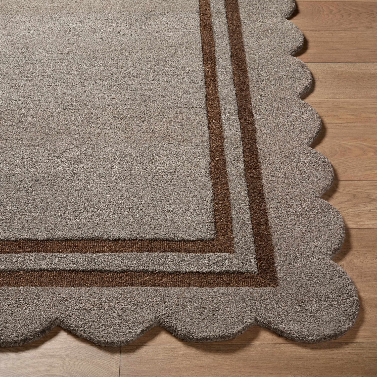 A hand-tufted wool rug with a warm taupe field, clean brown border, and a charming scalloped edge — minimalist style with a detail that makes it memorable.