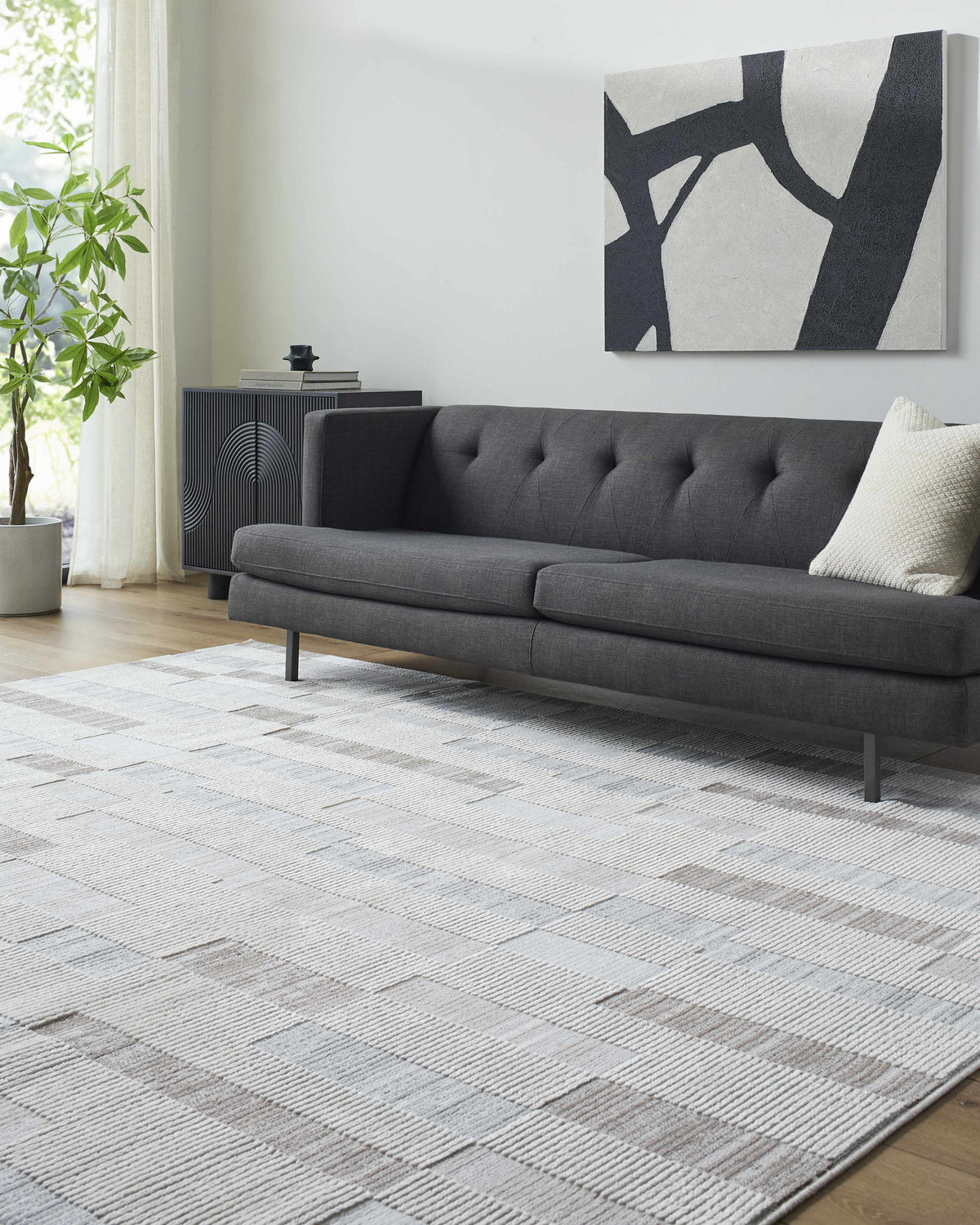 When selecting a living room rug, choose one that anchors your furniture by either placing all the legs on the rug or just the front legs, which helps define the seating area and enhances the room’s acoustics.
