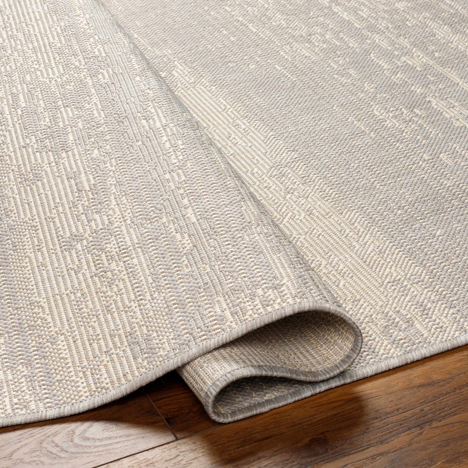 A softly distressed cream and gray flatweave that works just as beautifully on a covered patio as it does in your entryway — stain resistant, UV-proof, and effortlessly minimal.