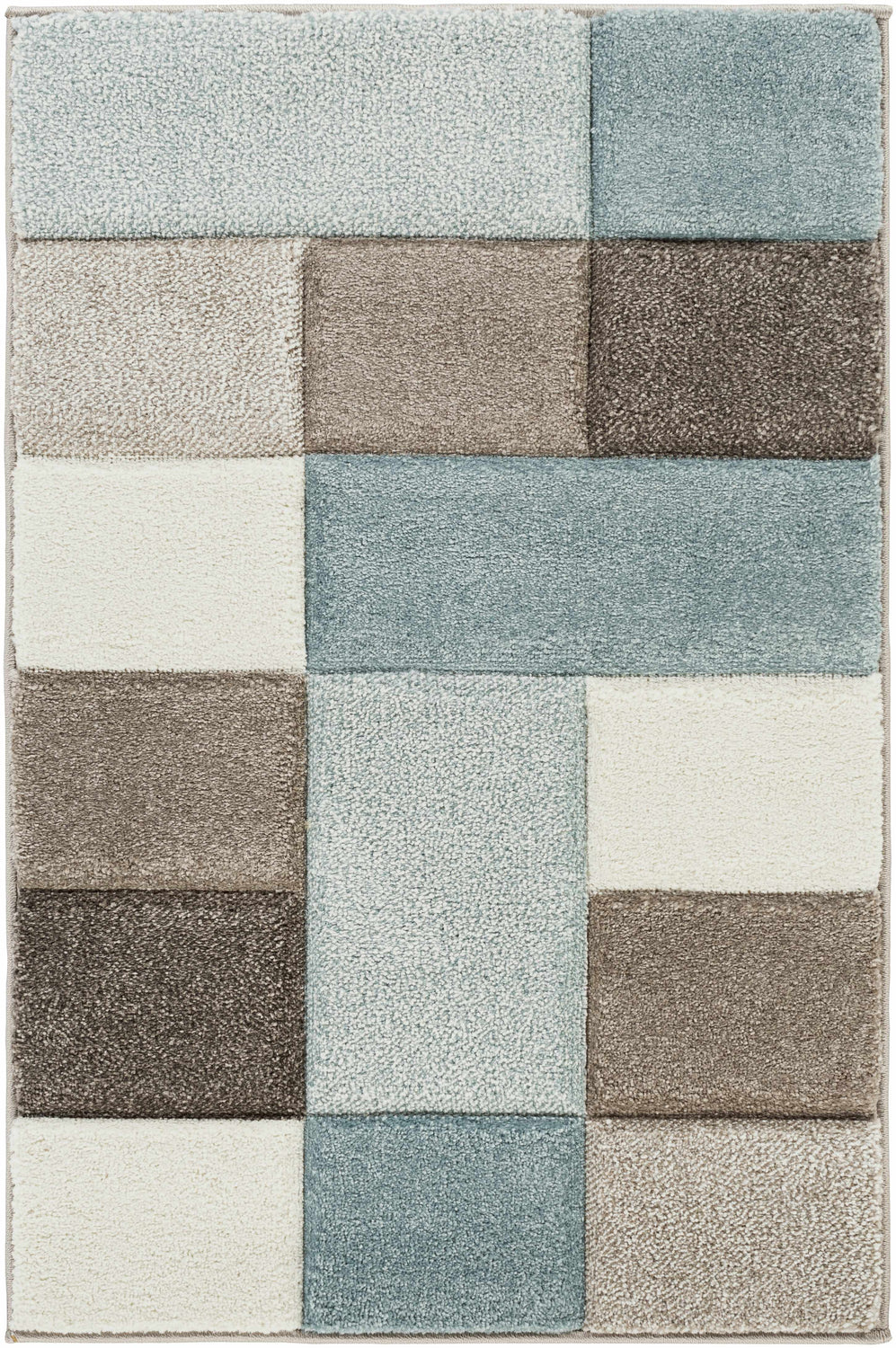 A cool-toned patchwork of blue, beige, and gray blocks that looks even better in person — soft, plush, and stain resistant for everyday living.