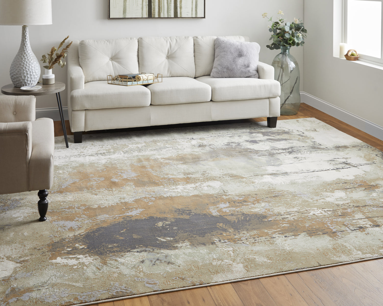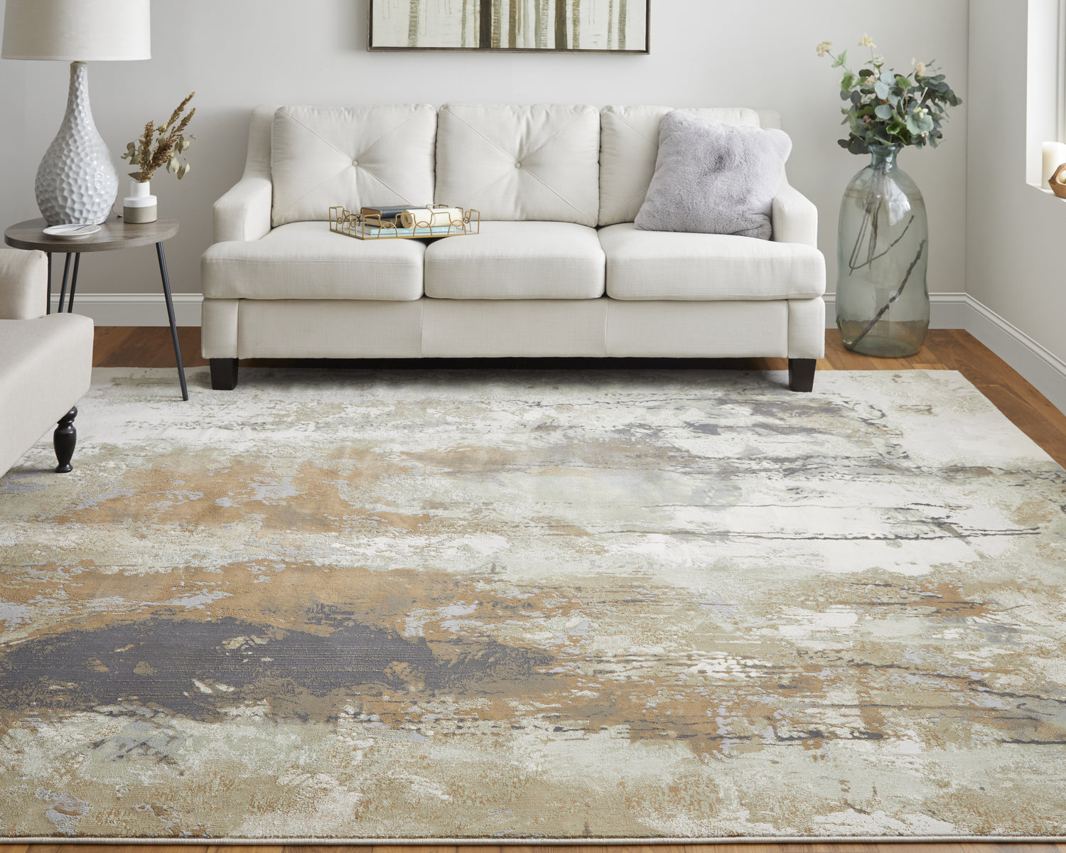 When selecting a living room rug, choose one that anchors your furniture by either placing all the legs on the rug or just the front legs, which helps define the seating area and enhances the room’s acoustics.