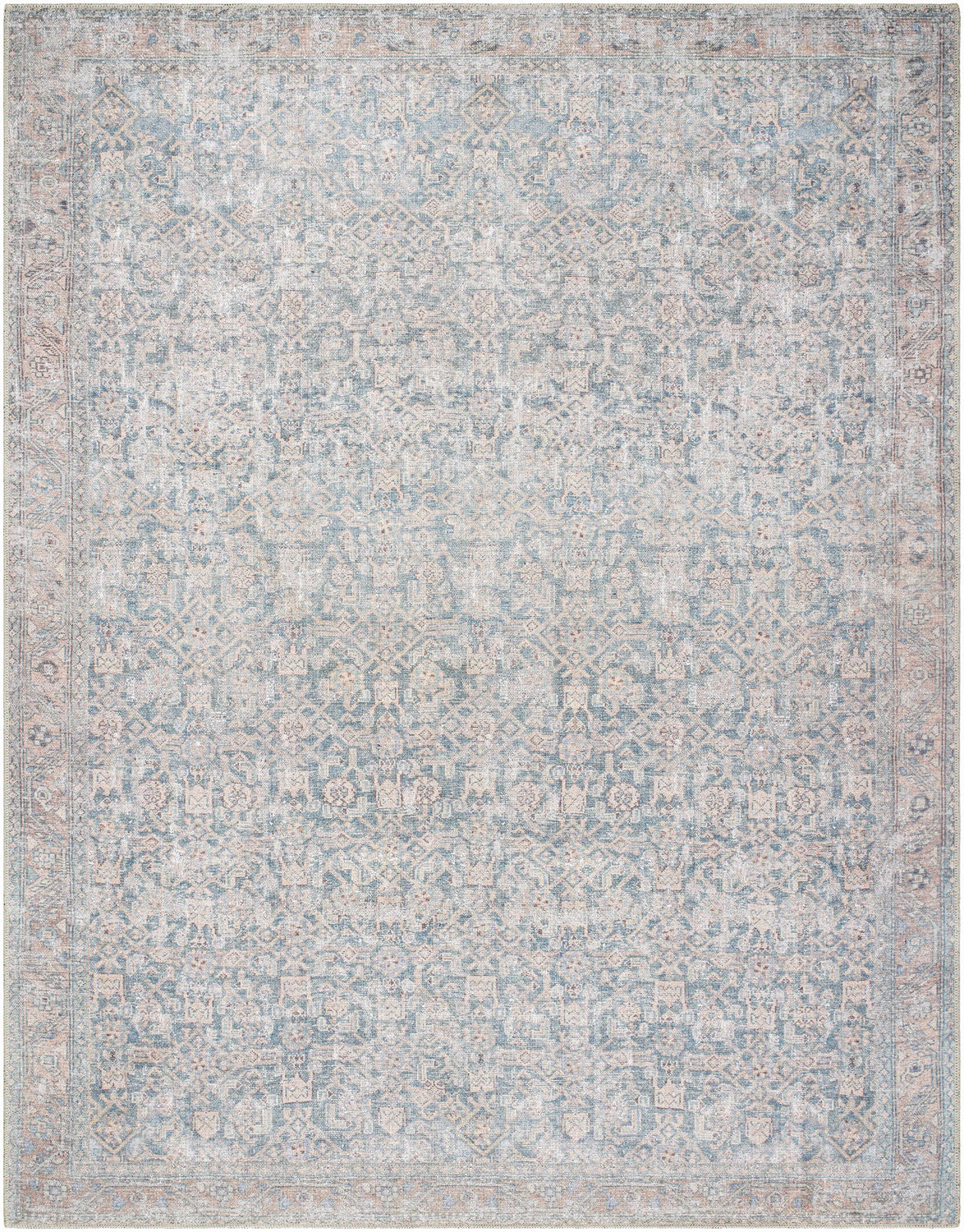 cool paletteA dusty, muted blue dominates the field, softened by layers of warm gray and cream that give the rug its faded, vintage feel — blush pink and soft tan accents peek through the floral motifs, creating a palette that feels both aged and quietly romantic.