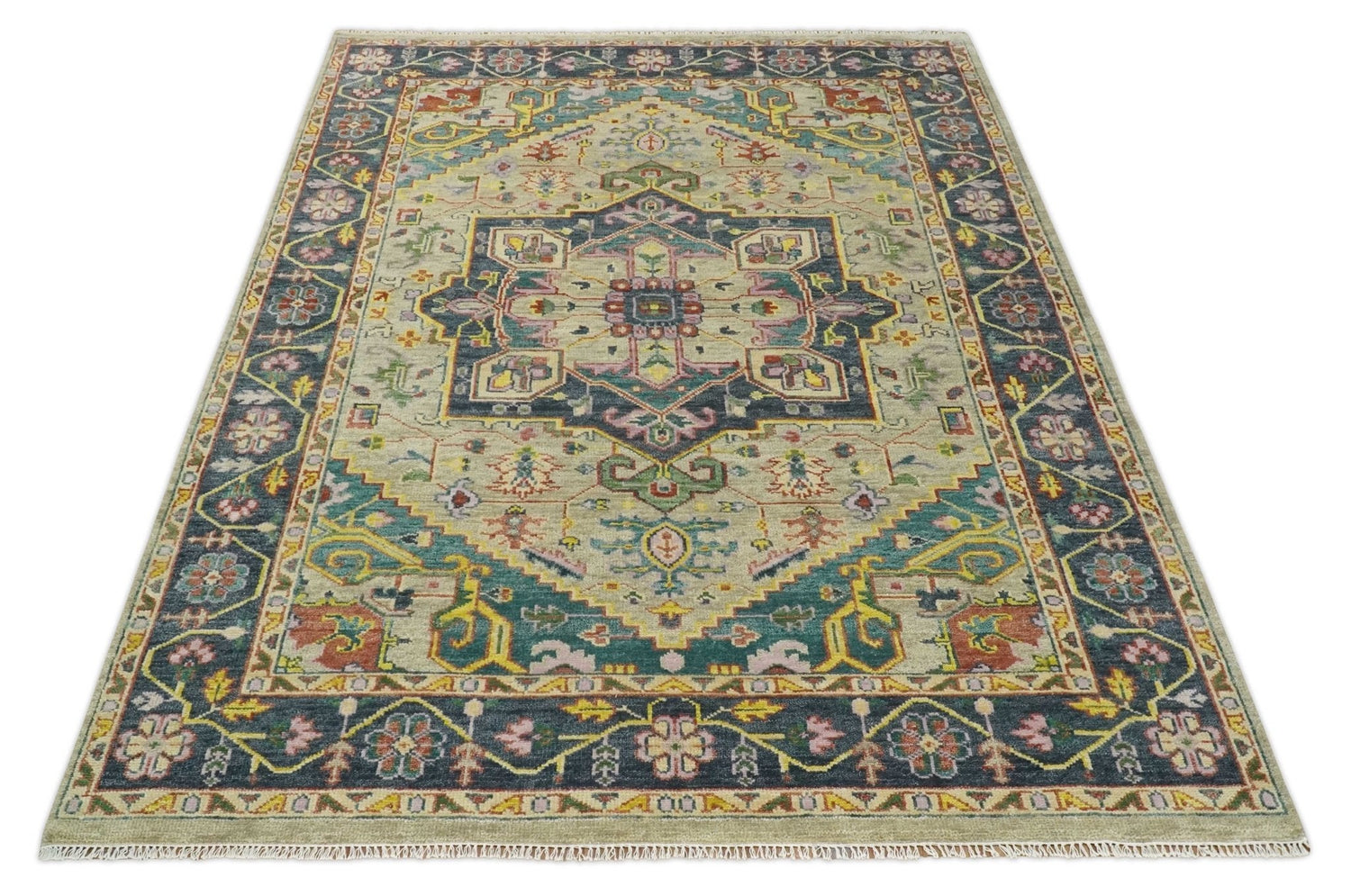 Custom Made Antique look Hand Knotted Camel, Teal and Charcoal Traditional Heriz Serapi Wool Rug