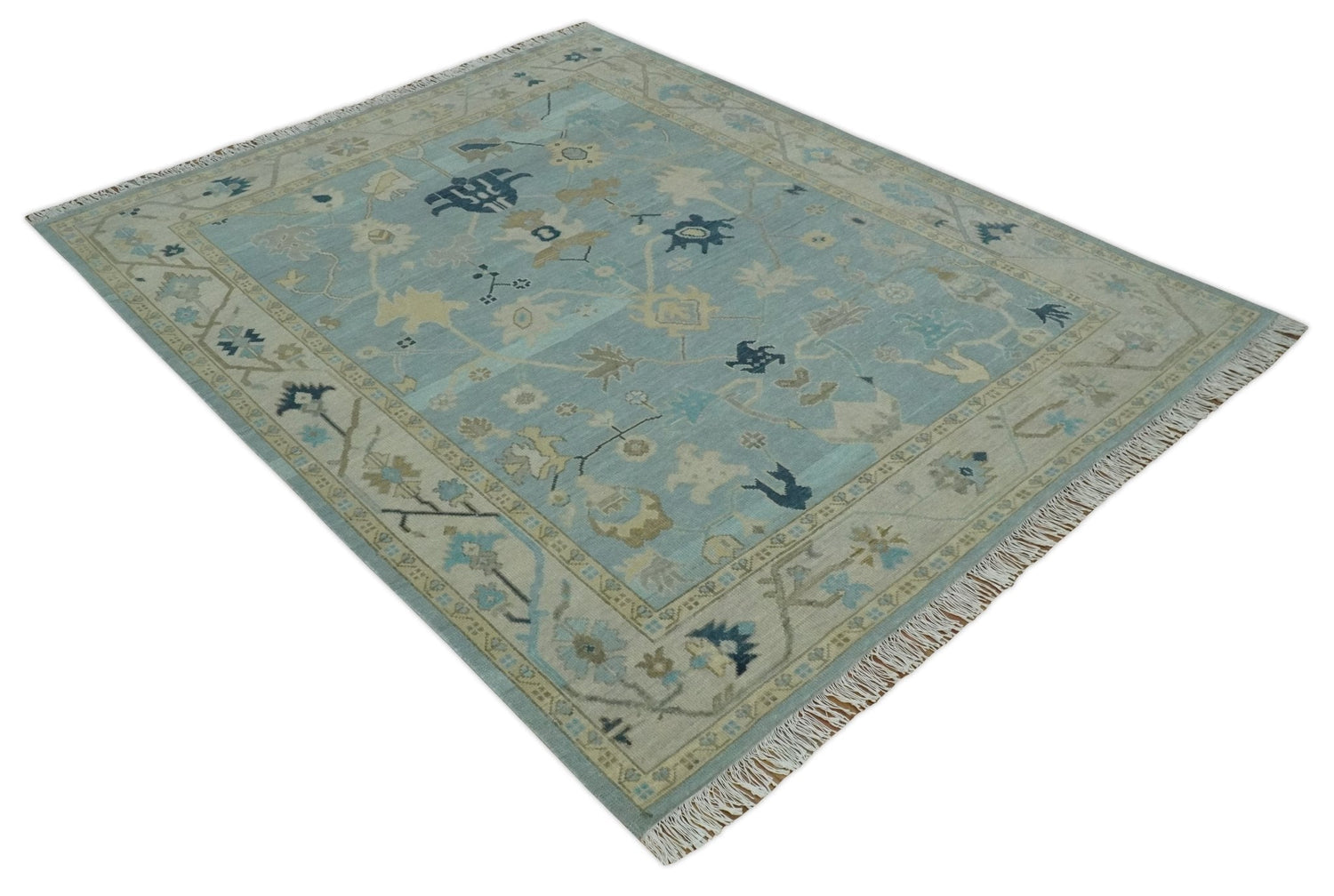 Custom Made Aqua, Ivory and Beige Hand knotted Oriental Oushak wool Area Rug