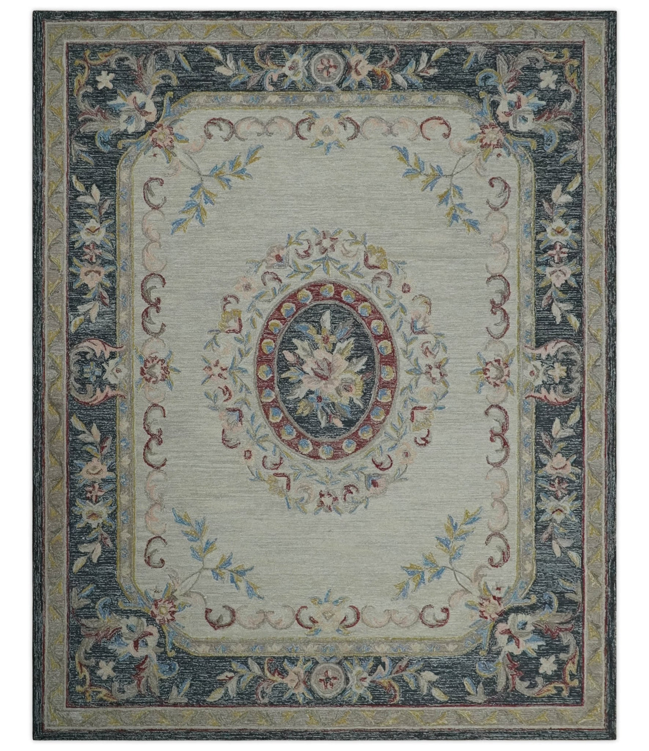 Custom Made Beige and Charcoal Aubusson French design Hand Tufted wool Area Rug