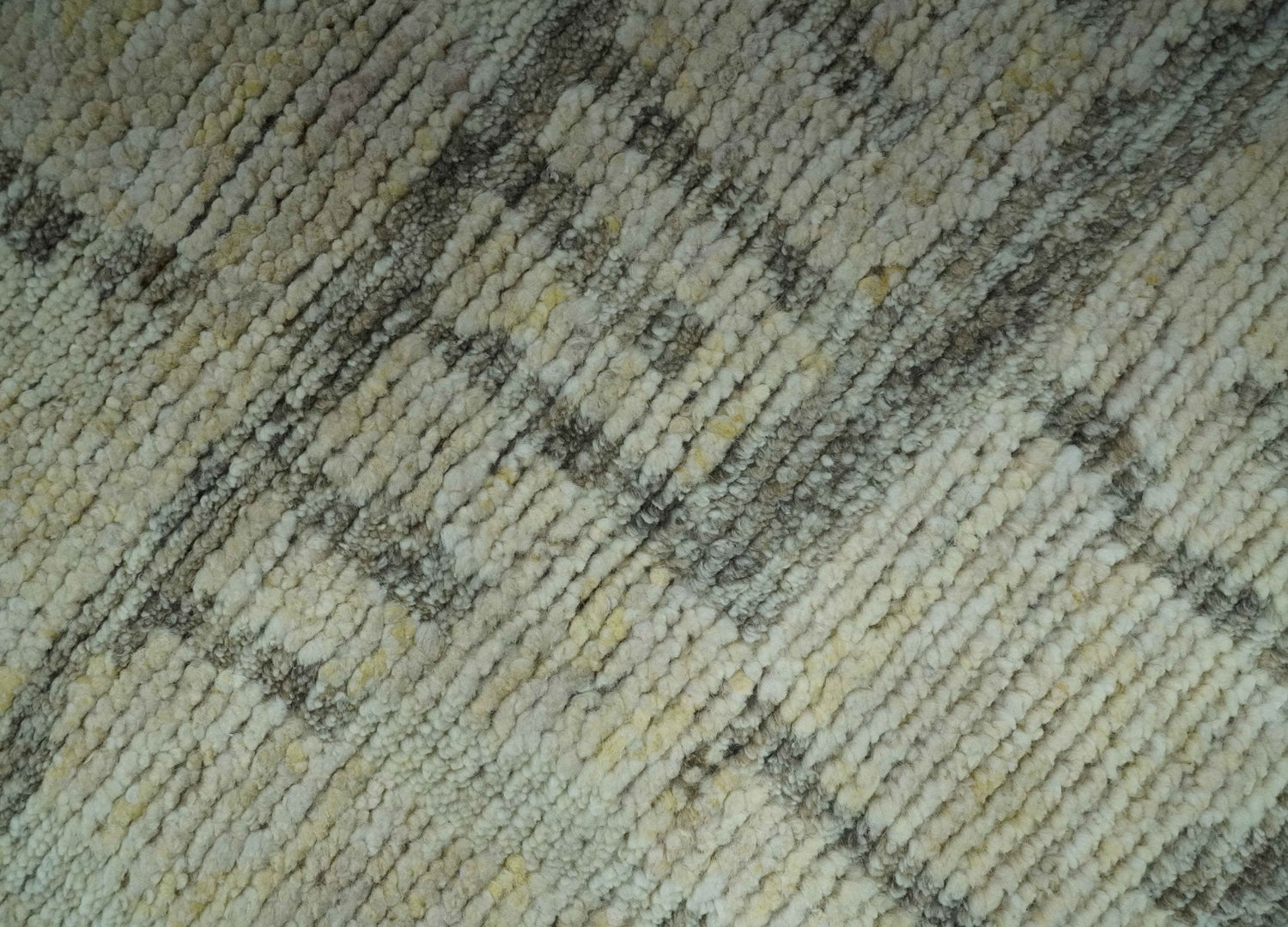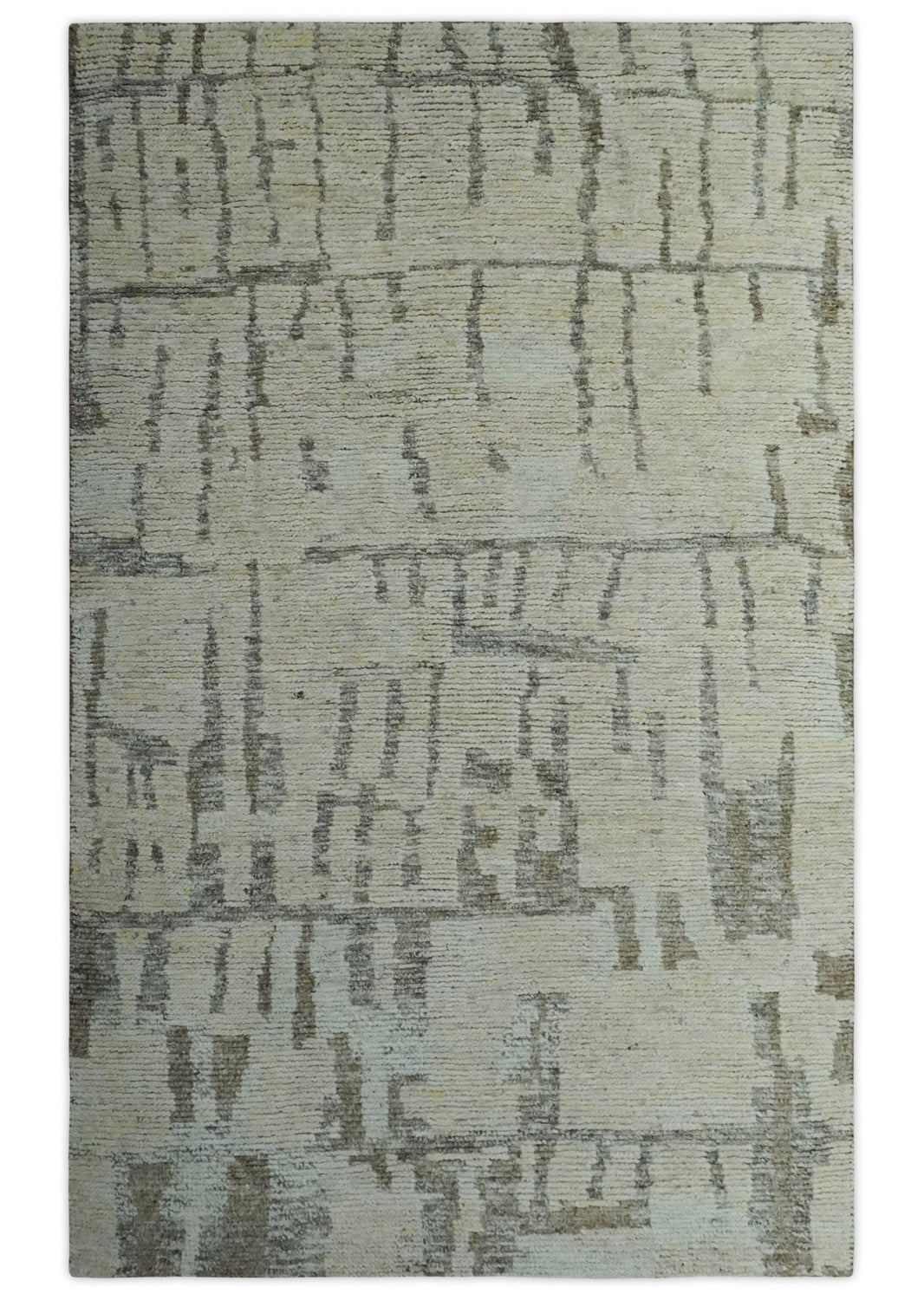 This custom-made area rug features a tasteful blend of beige, olive, and gray, creating a modern abstract design that is hand-knotted with high-quality wool. The result is a durable and stylish addition to any room, providing both warmth and aesthetic appeal.