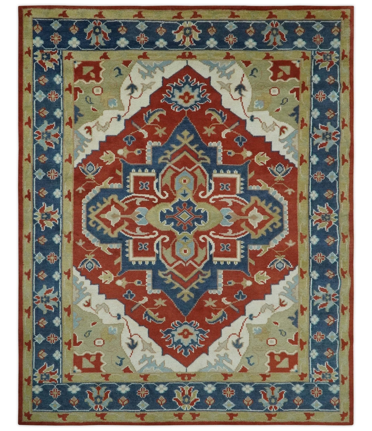 Custom Made Brown, Blue, Ivory and Olive Traditional Heriz Medallion Wool Area Rug