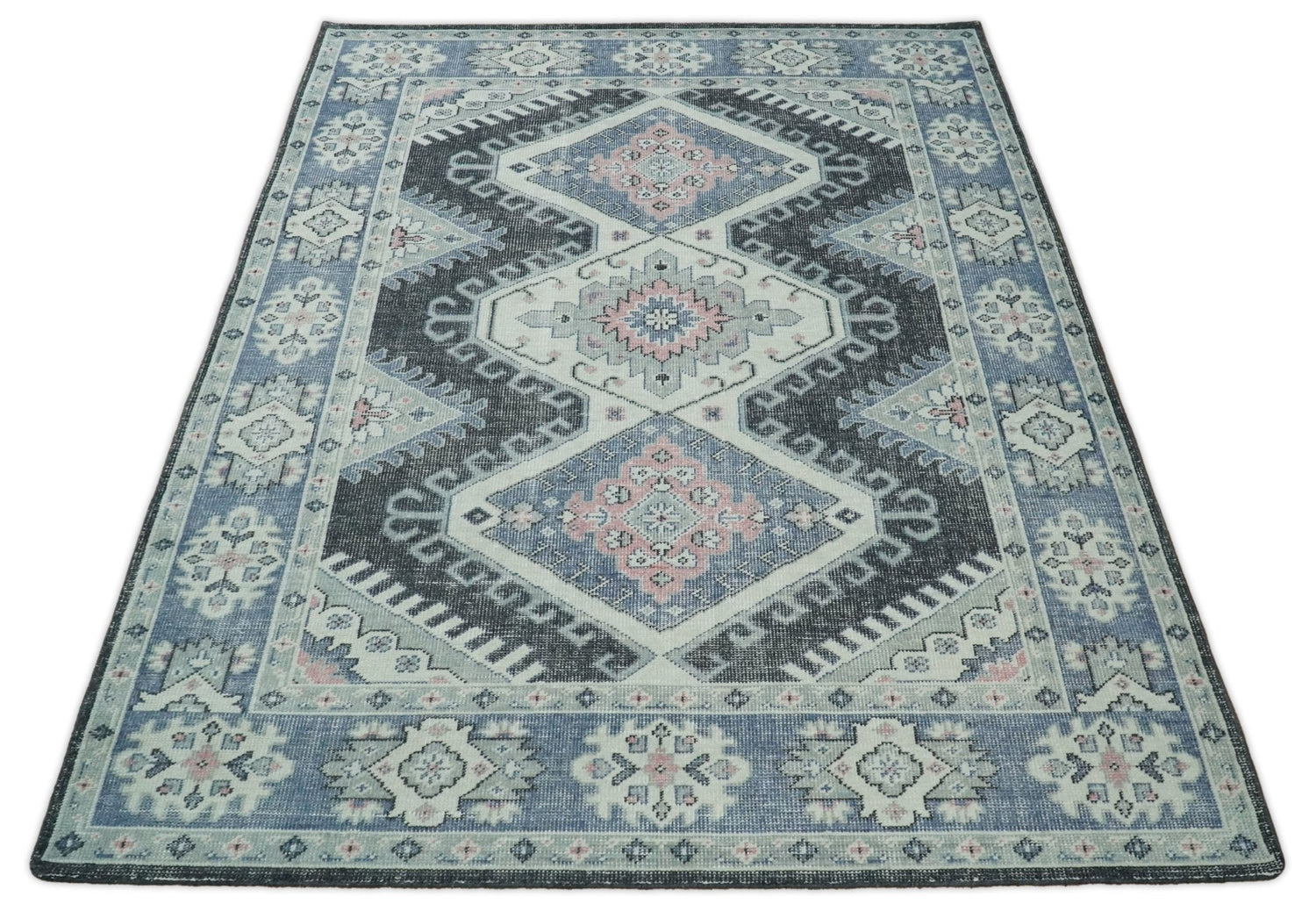 Custom Made Ivory, Charcoal, Silver and Blue Traditional Hand knotted wool Area Rug