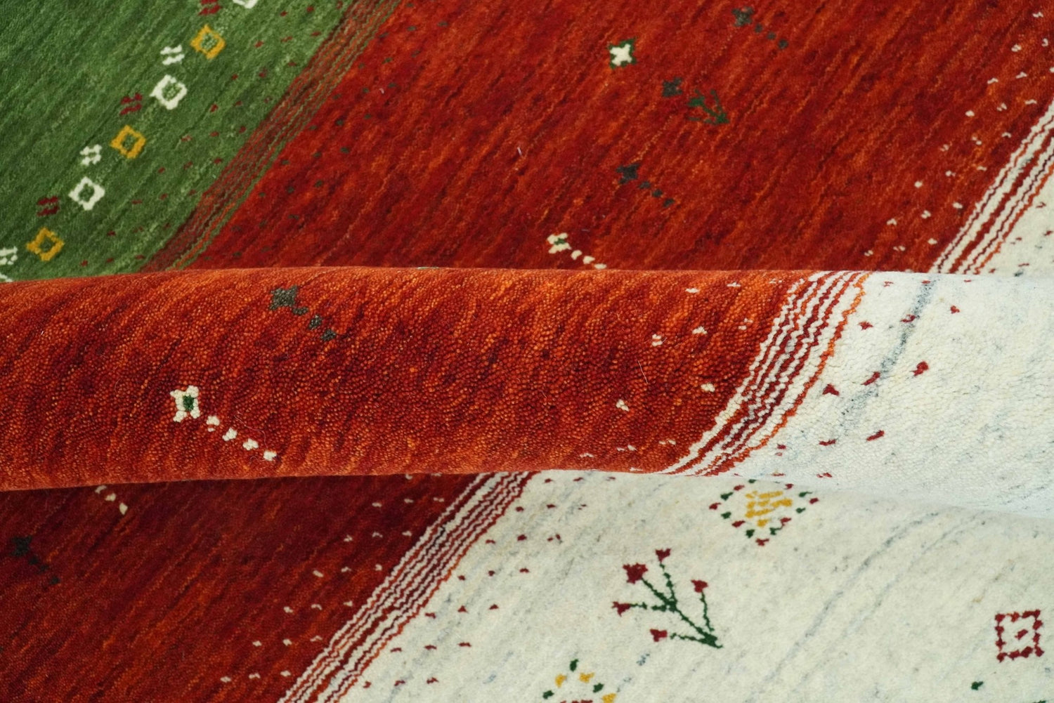 This custom-made Tribal Gabbeh rug boasts a striking striped design in ivory, gold, green, and maroon. Hand-loomed using high-quality wool, it offers a unique and durable addition to any living space. Elevate your decor with this beautiful and timeless geometric rug.