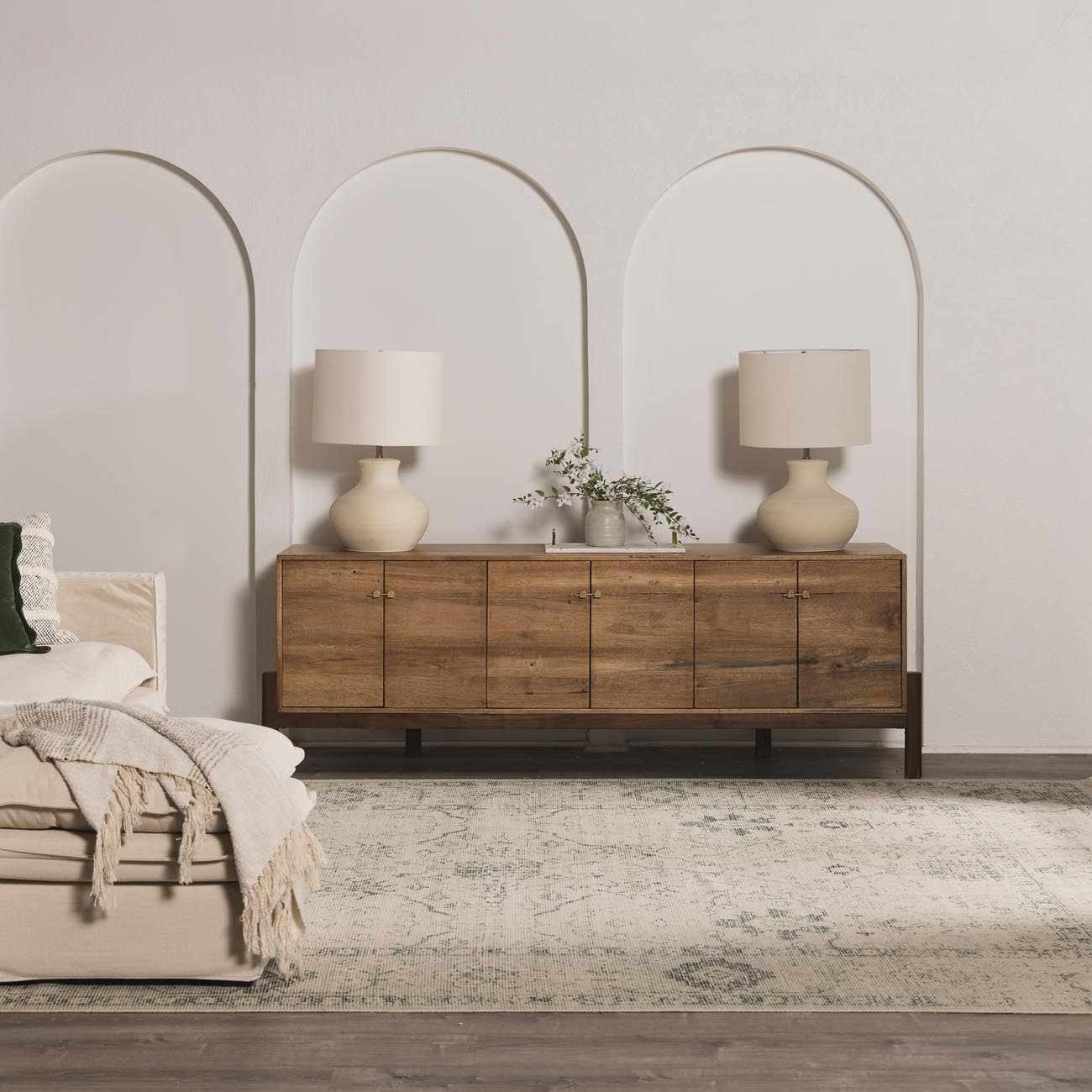 When selecting a living room rug, choose one that anchors your furniture by either placing all the legs on the rug or just the front legs, which helps define the seating area and enhances the room’s acoustics.