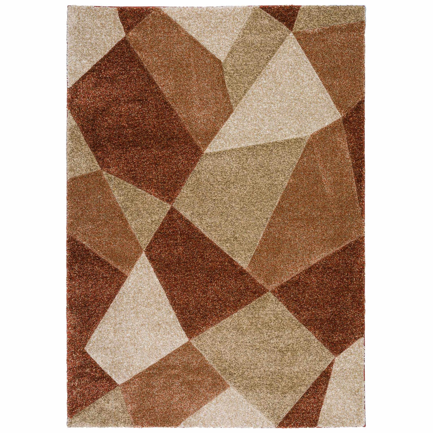 Bold geometric mosaic in warm rust, brown, and cream tones — the Carmona's plush 0.74" pile and striking angular pattern make it an instant room anchor.