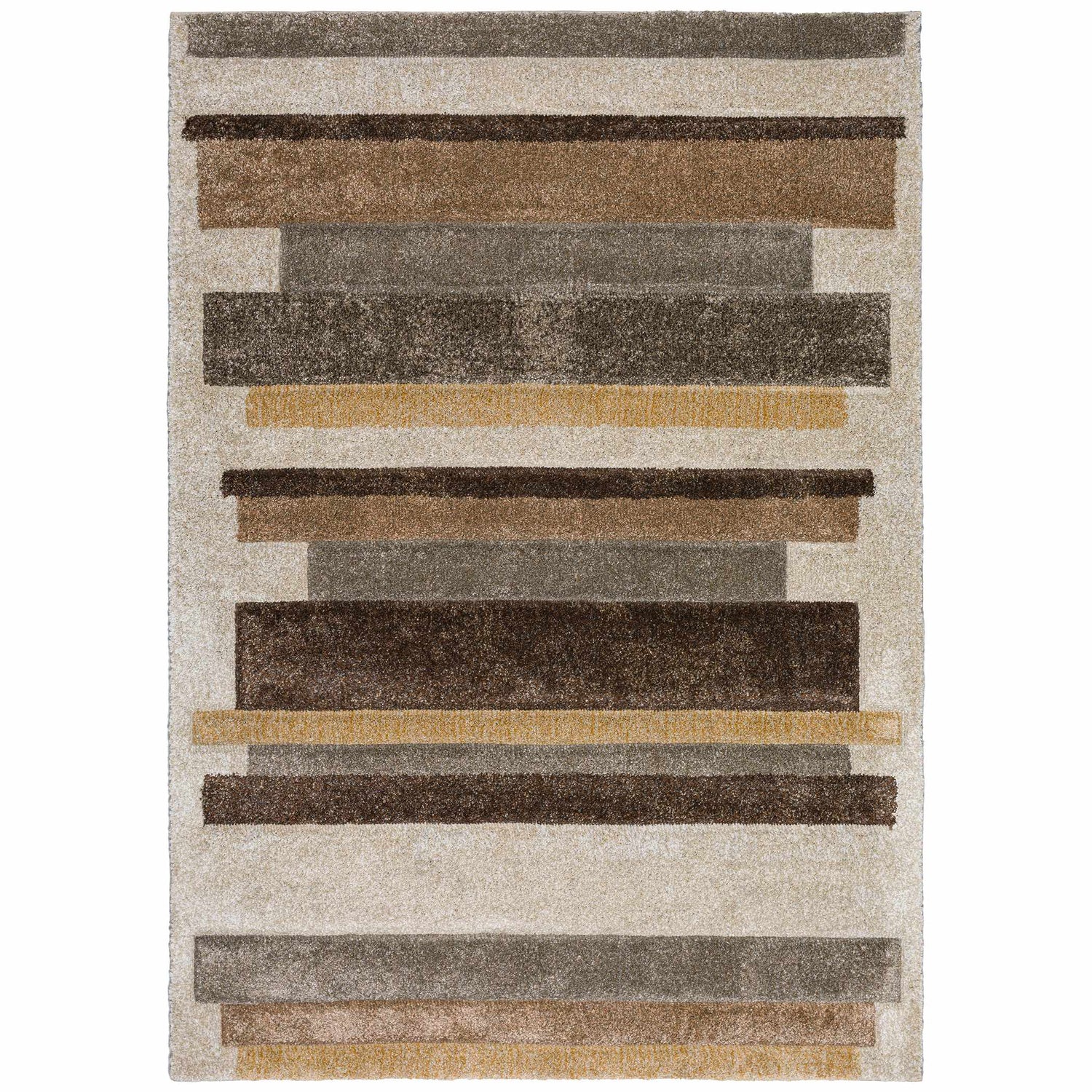 Staggered earth-tone stripes in beige, brown, gray, and mustard — the Carmona CO2 is a plush, modern statement rug that warms up any living space effortlessly.