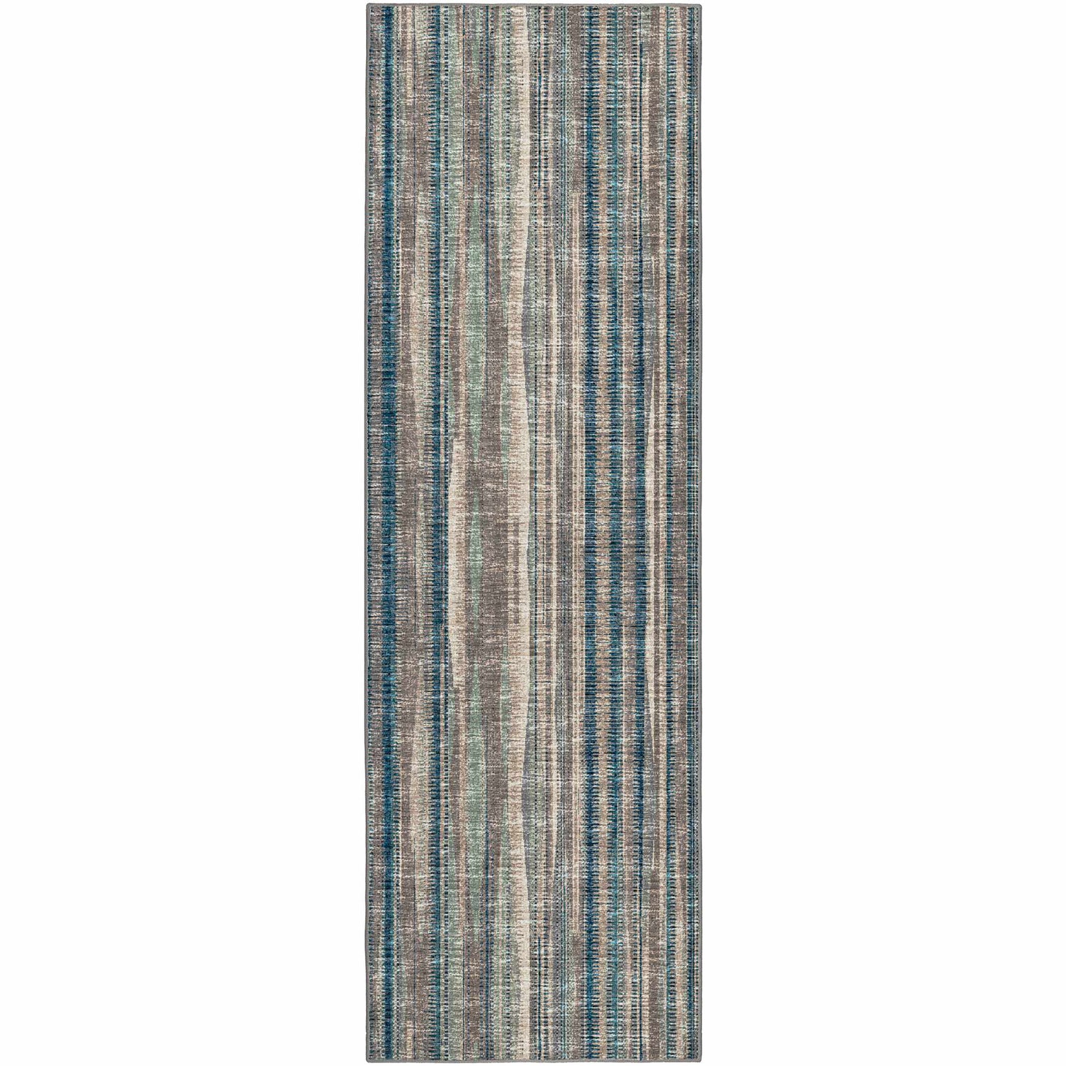 Distressed teal and gray stripes give the Dalyn Amador a relaxed, modern look that works just as well on the patio as in the living room — with a rubber-backed, outdoor-safe build to match.