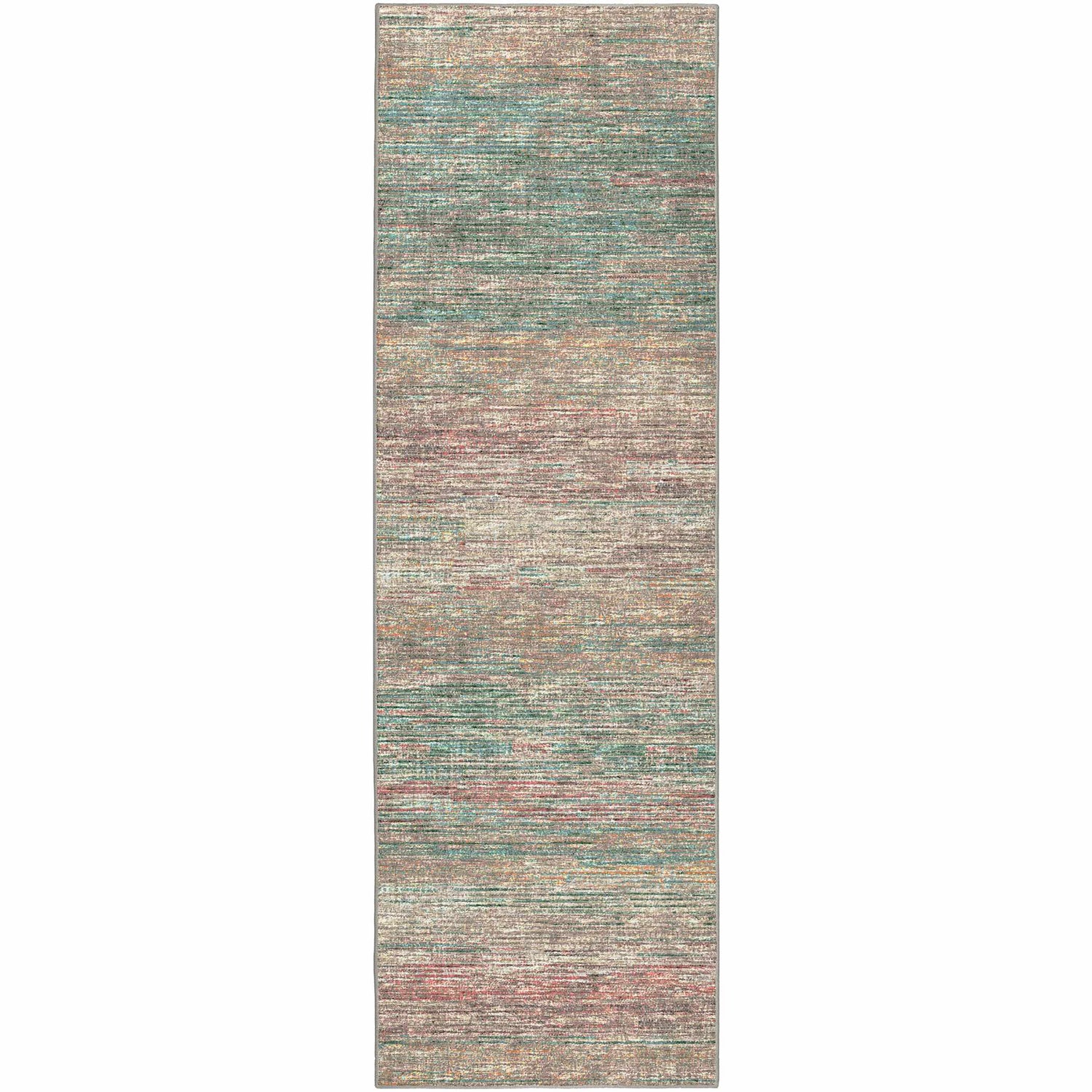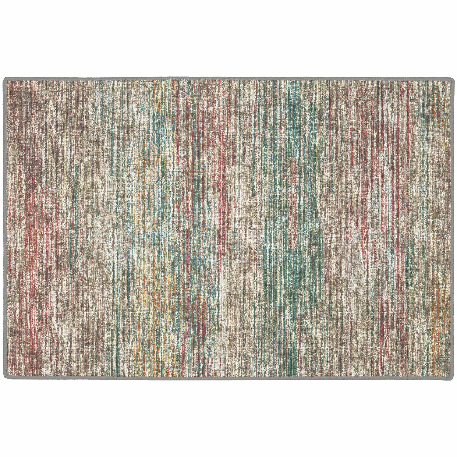 A rectangular area rug with a warm gray and beige base overlaid with dense vertical streaks and brushstroke-like lines in teal, red, burnt orange, mustard yellow, and medium brown — creating an allover abstract painterly pattern reminiscent of dragged watercolor strokes. The colors blend and overlap slightly, giving a soft distressed or faded quality without looking worn. The pile is low-to-medium, with a smooth machine-woven surface texture. Edges are cleanly bound with a thin gray border/serged edge. The overall impression at a glance is of a colorful, artistic, modern rug with warm earthy undertones balanced by cool teal accents.
