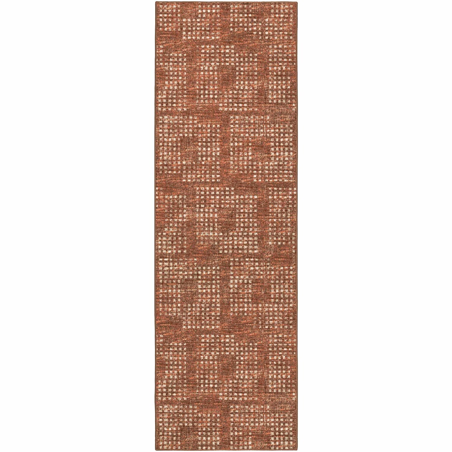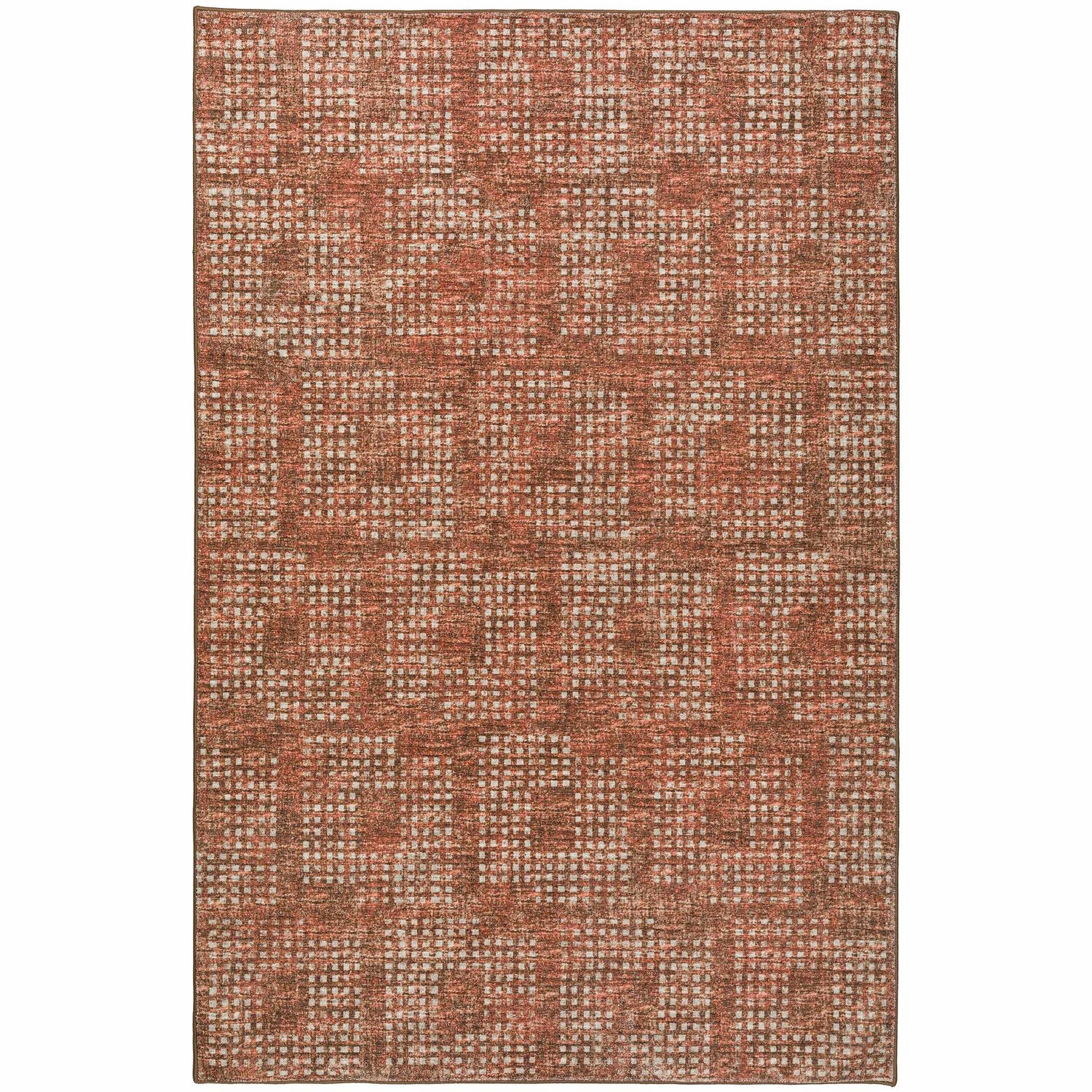 A warm paprika-toned geometric rug with a distressed grid pattern — tough enough for the patio, stylish enough for the living room.