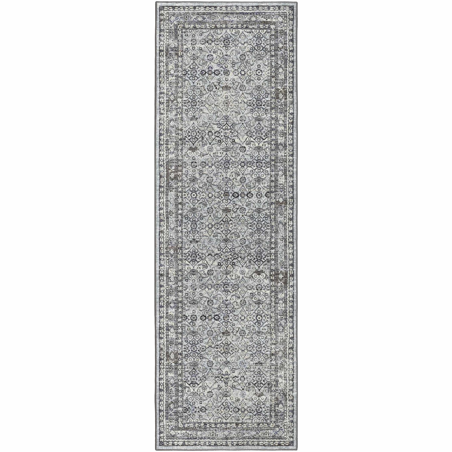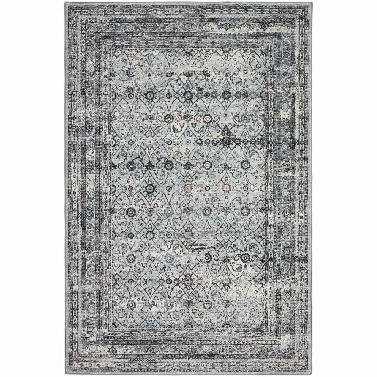 cool paletteA cool, muted palette dominated by soft pewter gray with layers of dusty blue, cream, and charcoal woven throughout — the faded, distressed finish gives the whole rug an antique silver-blue quality that feels calm and sophisticated.