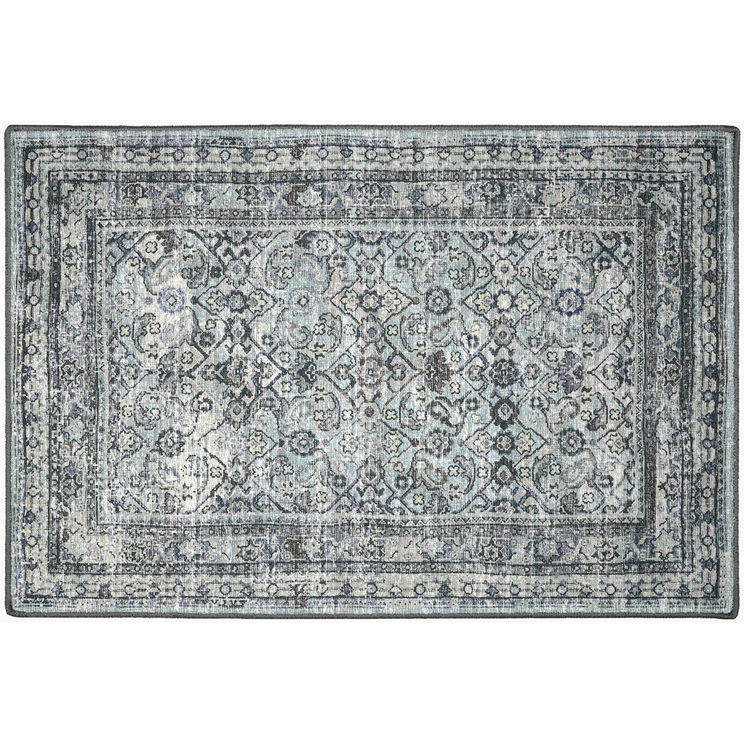 - Distressed Persian medallion pattern in cool gray and blue tones