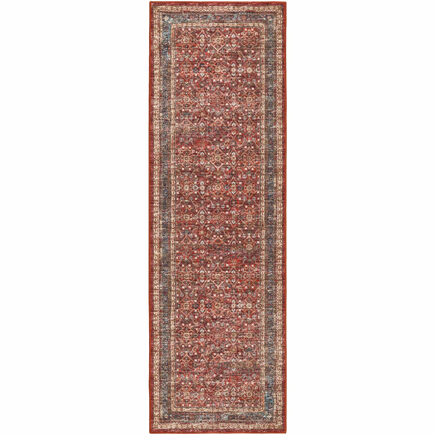 warm paletteA bold scarlett red dominates the field, layered with warm beige and cream floral motifs and accented by dusty blue border details and brown tones — a rich, earthy palette that feels both vibrant and aged.