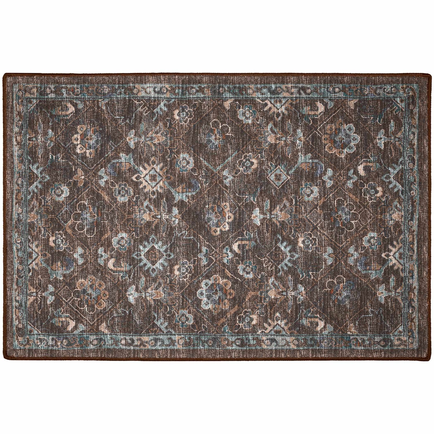 - Vintage-distressed Persian floral pattern in rich sable brown and faded teal