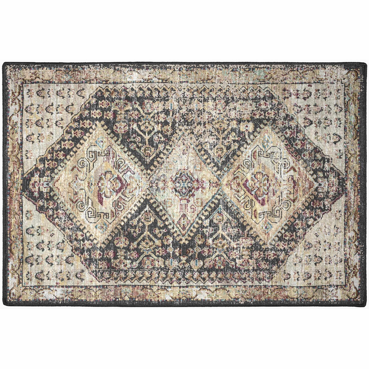 A rectangular area rug with a deep midnight black field featuring a triple-diamond medallion layout as the central design — three large connected diamond shapes filled with intricate Persian-style floral and geometric motifs in warm beige, cream, and golden tones. Jewel-toned accents of teal, red, and yellow appear within the medallion details. The surrounding field is filled with small repeating traditional motifs, and a multi-layered border frames the entire rug with geometric and floral banding. The finish has a subtle distressed, vintage-washed quality that softens the contrast. The pile is low and smooth with a machine-woven surface, and the edges are cleanly bound in dark charcoal. Overall impression: bold, rich, and globally inspired with an antique character.
