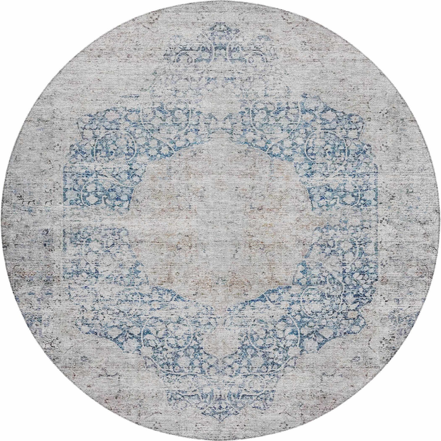 A faded blue-gray Persian medallion design that looks like a vintage heirloom — but it's fully washable, outdoor-safe, and built for everyday life.