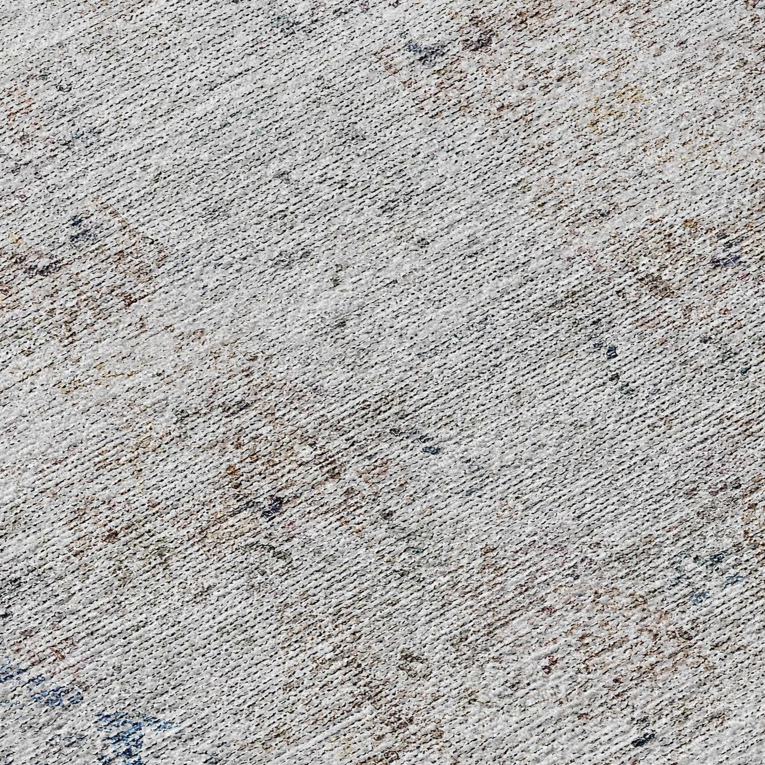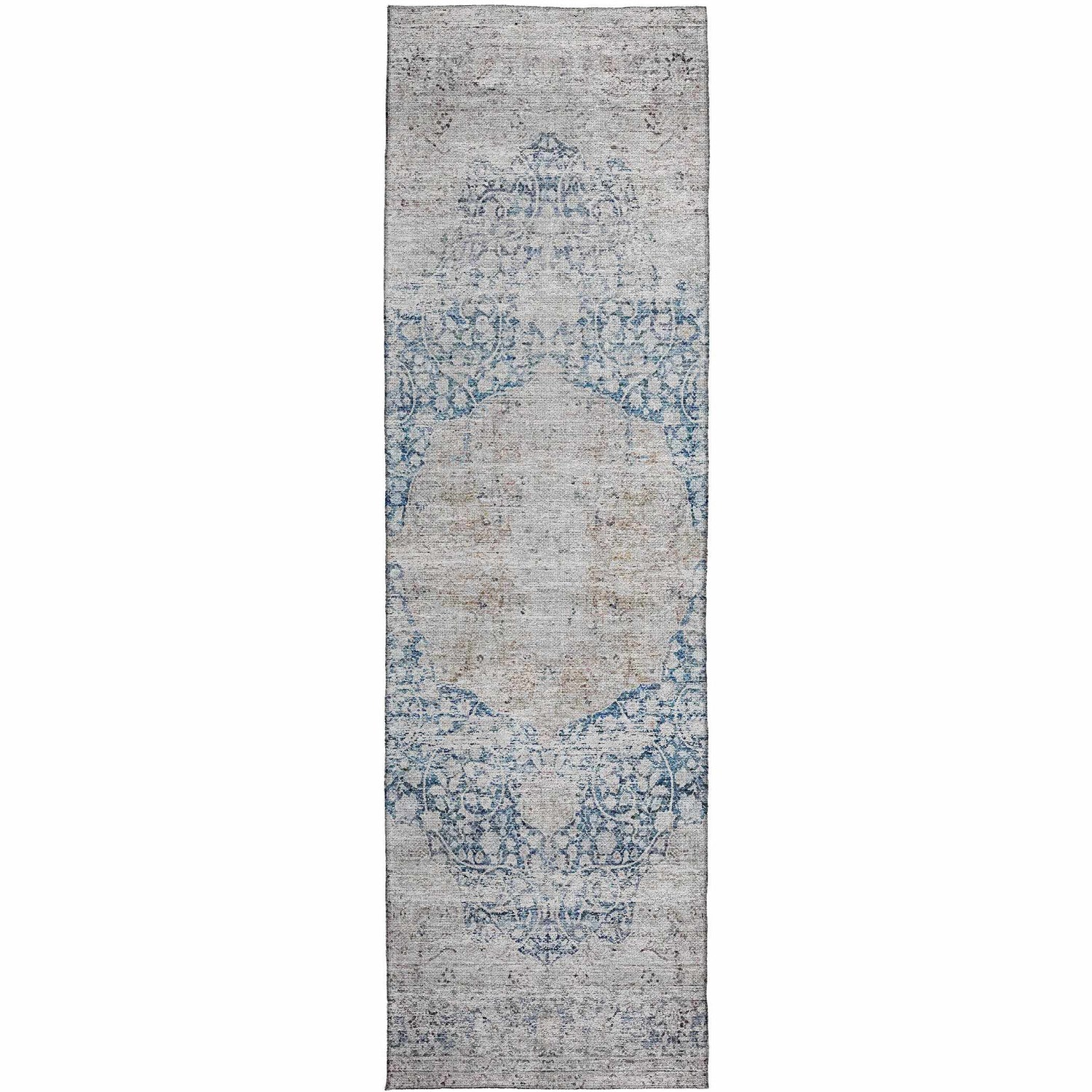 cool paletteA cool, muted palette of slate blue and soft gray dominates the surface, with the central medallion rendered in deeper cobalt blue tones that fade outward — giving the whole rug a sun-washed, gently worn quality that feels both timeless and relaxed.