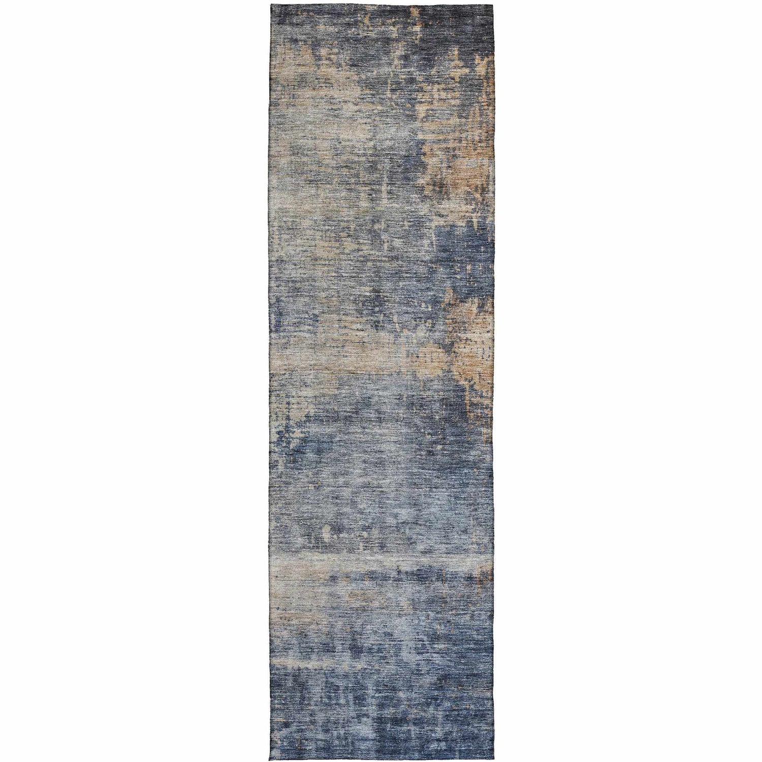 A rectangular area rug with an allover abstract, painterly design that mimics the look of a distressed or faded canvas. The dominant color is a rich denim blue that covers roughly half the surface, blending into cool medium gray across the center and upper portions. Warm sandy beige and tan tones emerge organically in the lower-center and corner areas, creating a natural, unplanned feel. The pattern has no hard edges — colors bleed and fade into one another like watercolor washes or weathered paint on a wall. The pile is low and tight, giving the surface a smooth, woven texture with a subtle sheen. Edges are cleanly bound with no fringe or tassels. Overall impression: moody, artistic, and contemporary with an intentionally worn, lived-in aesthetic.