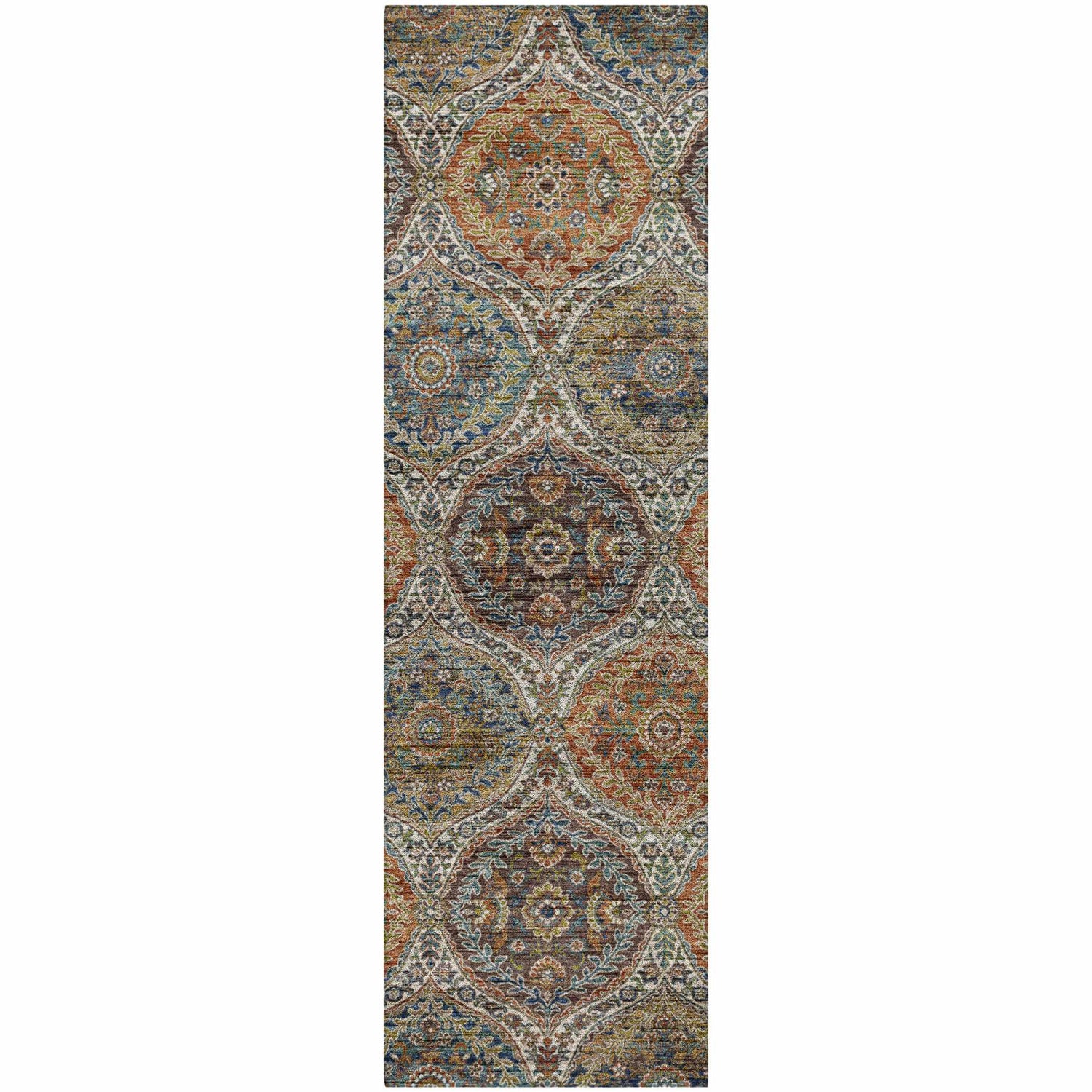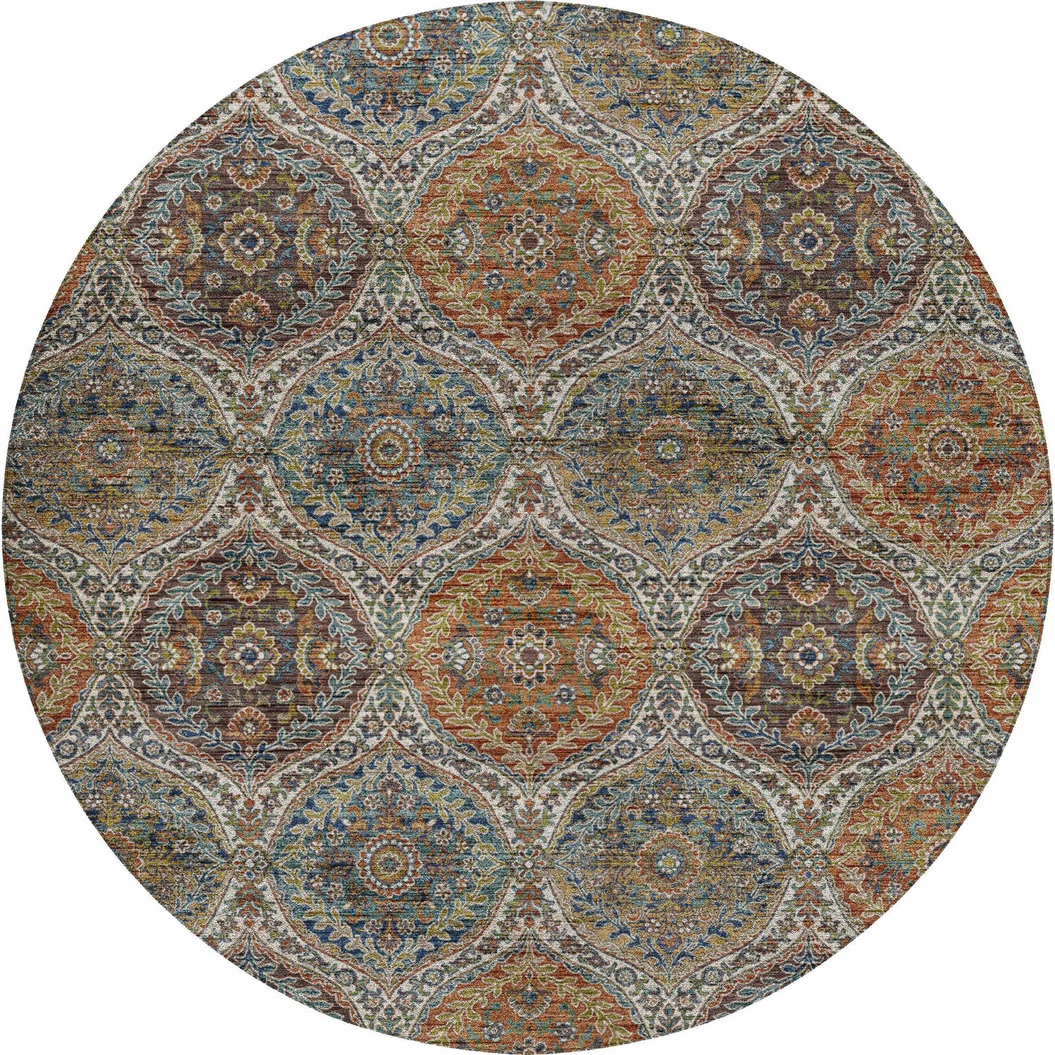 Persian medallion beauty meets outdoor durability — the Silk Road SR12 brings rich multicolor earth tones and intricate circular motifs to your patio, porch, or deck.