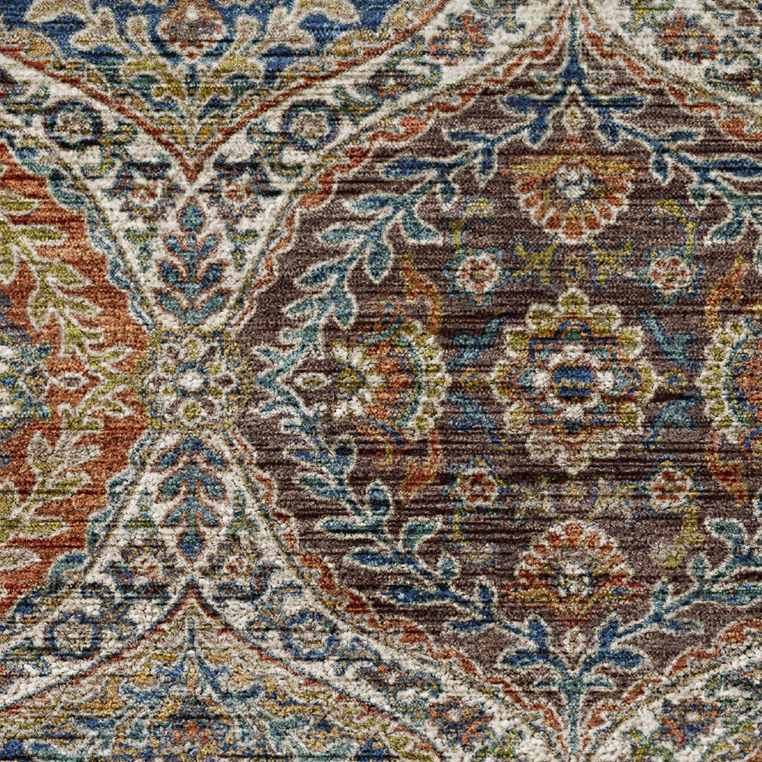 warm paletteA warm, jewel-toned earth palette anchored by rich brown and deep blue, with accents of red, orange, green, and teal woven throughout the medallion motifs — the overall effect is layered and vibrant, like a well-traveled antique bazaar find.