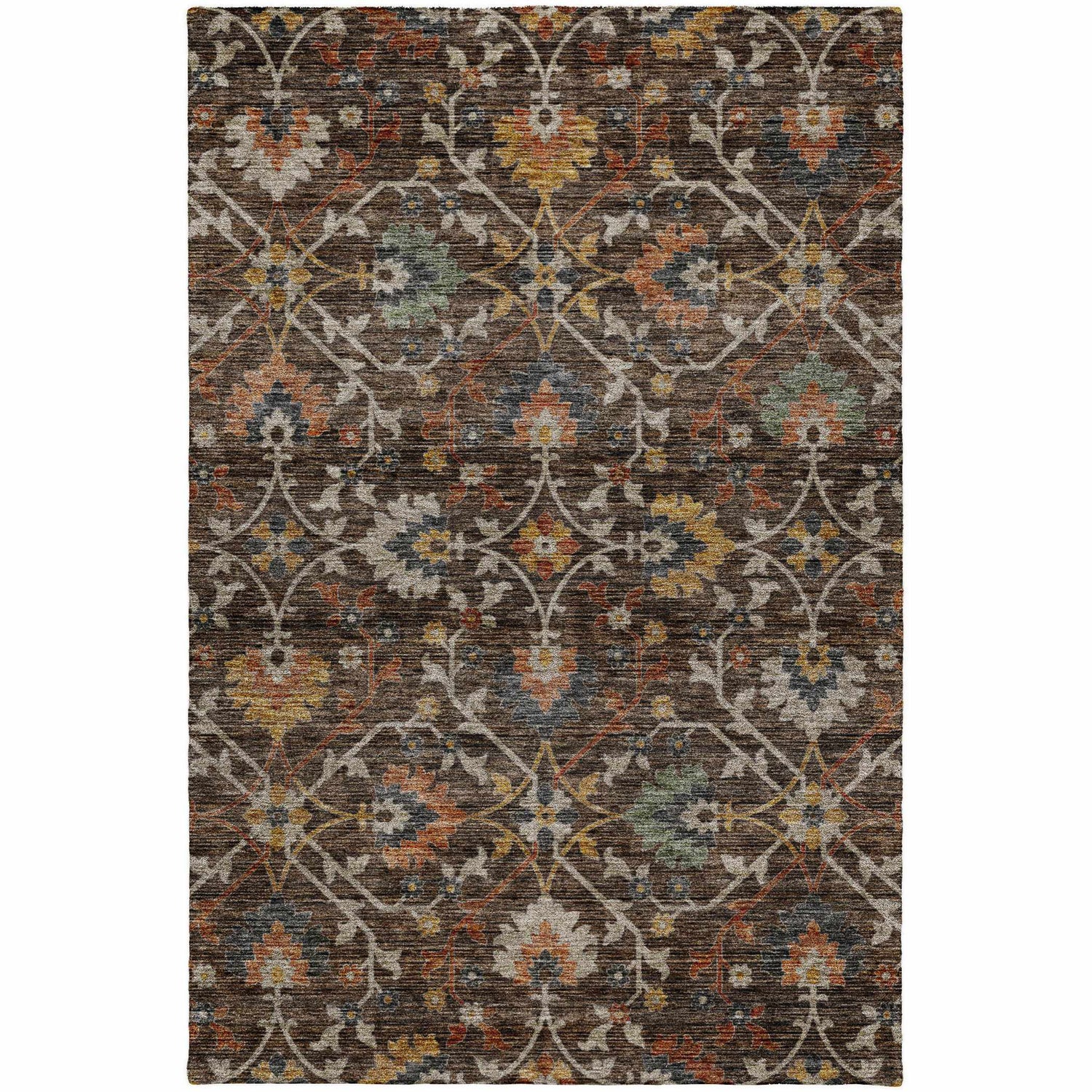- Rich chocolate brown base with distressed Persian floral pattern