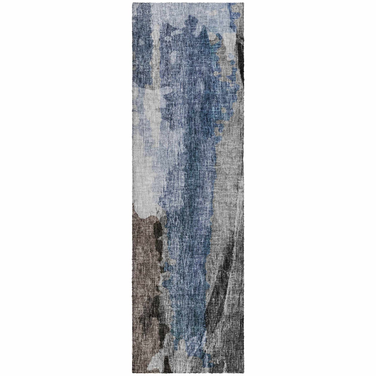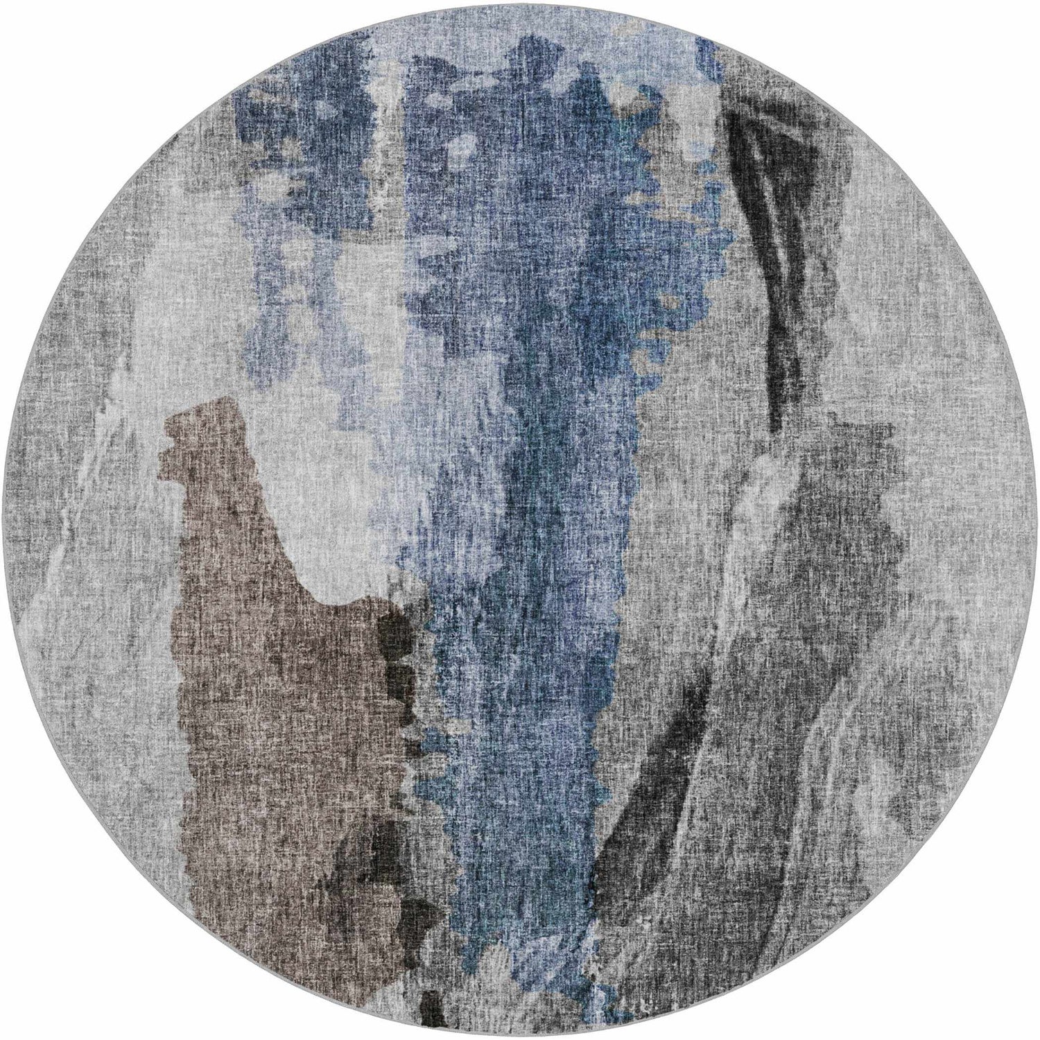 A watercolor-inspired abstract in steel gray and denim blue — fully washable, plush at 0.86", and rubber backed for a no-slip hold.