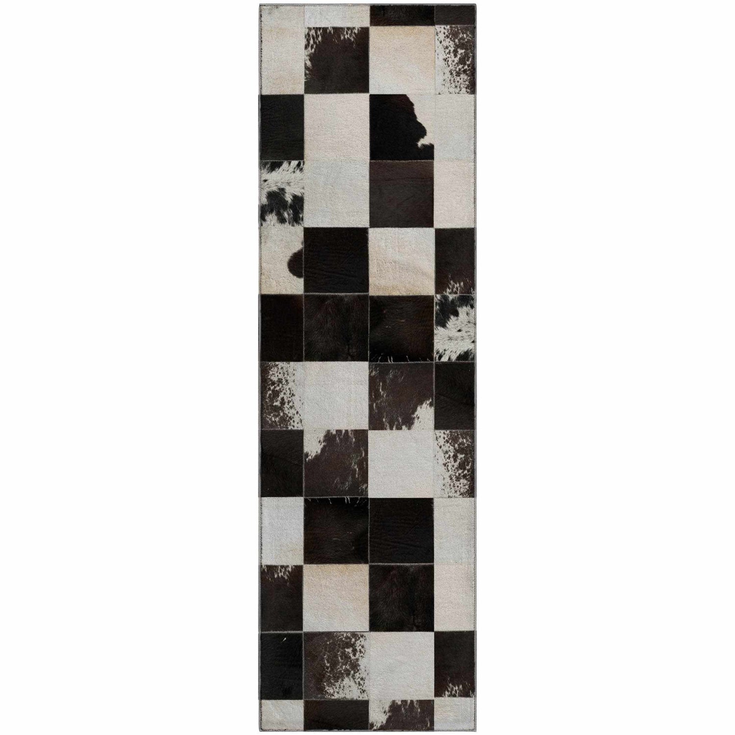 neutral paletteDeep espresso black dominates, balanced by speckled black-and-white panels and warm chocolate brown patches, with a single beige-tan square adding a lighter accent — the overall palette feels like a natural cowhide hide pulled straight from a ranch.