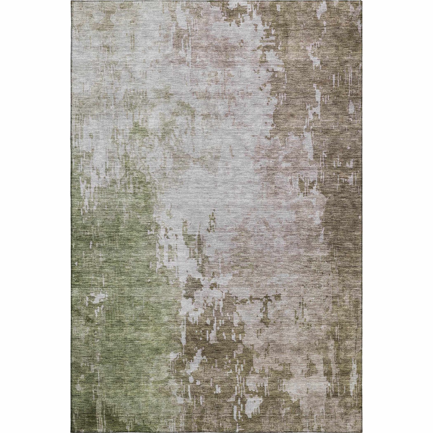 A rectangular area rug with an allover abstract, painterly design that transitions from a rich mossy green in the upper portion to cool gray and warm brown tones in the lower half, creating a soft ombre-like gradient effect. The surface has a deliberately distressed, worn appearance with irregular brushstroke-like variations in color density — lighter silver-gray patches bleed through the green and brown fields, mimicking the look of a faded, aged textile. The pile is medium height with a smooth, slightly textured machine-woven surface. Edges are cleanly bound with no fringe or tassels. The overall impression is of an abstract watercolor painting rendered in muted, earthy tones — sophisticated and organic at the same time.