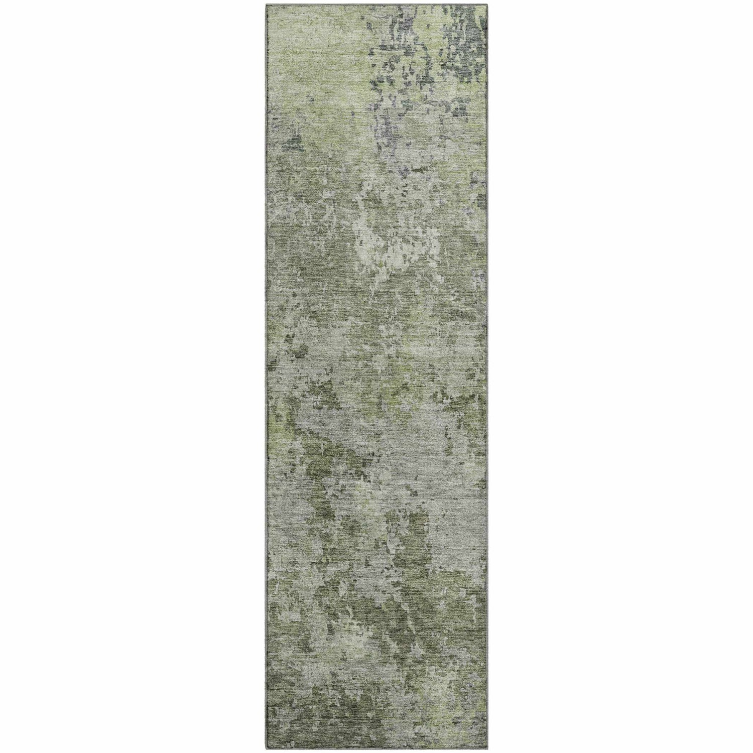A rectangular area rug with an allover abstract, distressed pattern dominated by layered sage, olive, and medium green tones across approximately 55% of the surface. Cool gray undertones bleed through in irregular patches covering roughly 25% of the rug, with soft white and pale highlights scattered throughout creating a mottled, weathered canvas effect. The pattern has no defined repeat — it reads as an organic, painterly wash of color with vertical streaking and blotchy texture reminiscent of an overdyed or vintage-washed finish. The pile is medium height with a smooth, machine-woven surface texture. Edges are cleanly bound with no fringe or tassels. The overall impression is of a sophisticated, faded-abstract rug with a calm, nature-inspired palette.