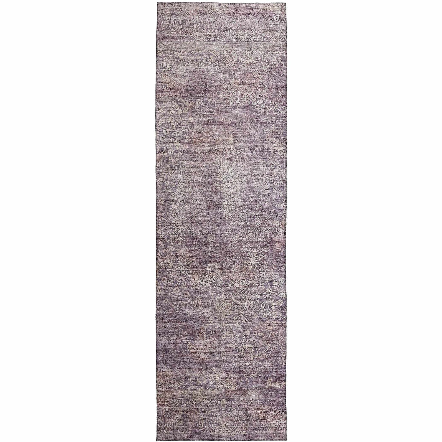 cool paletteA deep, moody plum dominates the surface with a faded, washed-out quality — gray and beige undertones bleed through the distressed finish, giving the rug a layered, antique feel rather than a flat solid color.