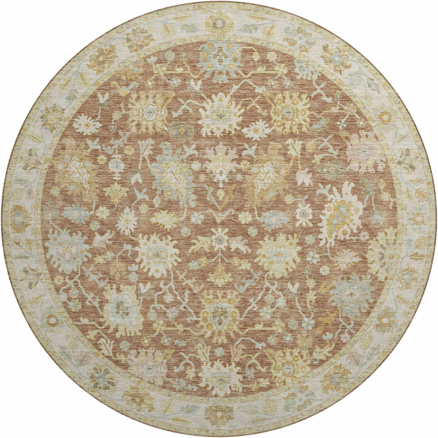 The Dalyn Hatay HY2 brings the timeless beauty of an Oushak-style rug to modern living — with the added bonus of being fully washable and outdoor-safe. The warm terracotta-brown field is filled with an allover traditional floral and vine pattern in soft cream, sage green, and tan, all framed by a classic cream border. The palette is earthy and inviting, the kind of rug that makes a room feel instantly grounded and layered. At 0.5 inches thick, it has a satisfying medium pile that feels comfortable underfoot without being too plush for outdoor use. Made from durable polypropylene with a cotton backing, it's built to handle foot traffic, pets, and the elements — then toss it in the wash when life happens. Whether you're styling a covered patio, a sunroom, or a traditional living room, the Hatay delivers classic elegance that doesn't require precious care. It's the rare rug that looks like an heirloom but lives like a workhorse.