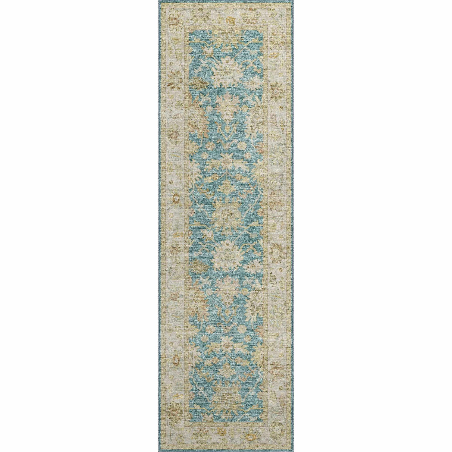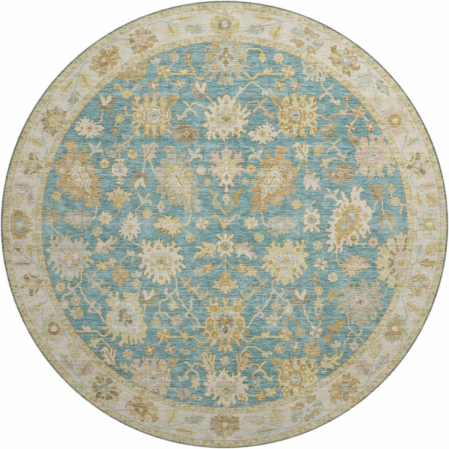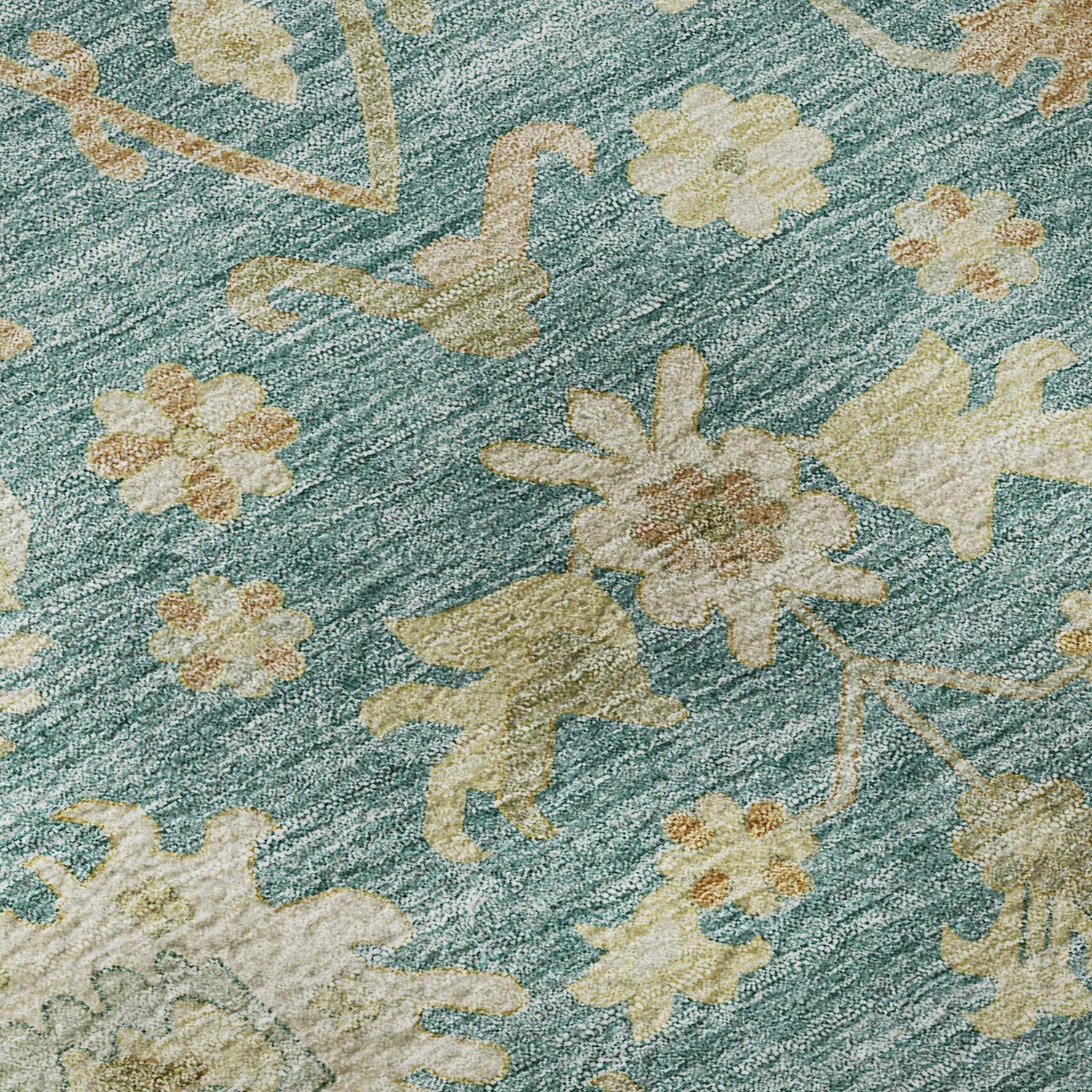 A stunning teal Oushak floral rug that's fully washable and outdoor-safe — traditional style meets zero-stress maintenance for patios, porches, and living rooms.