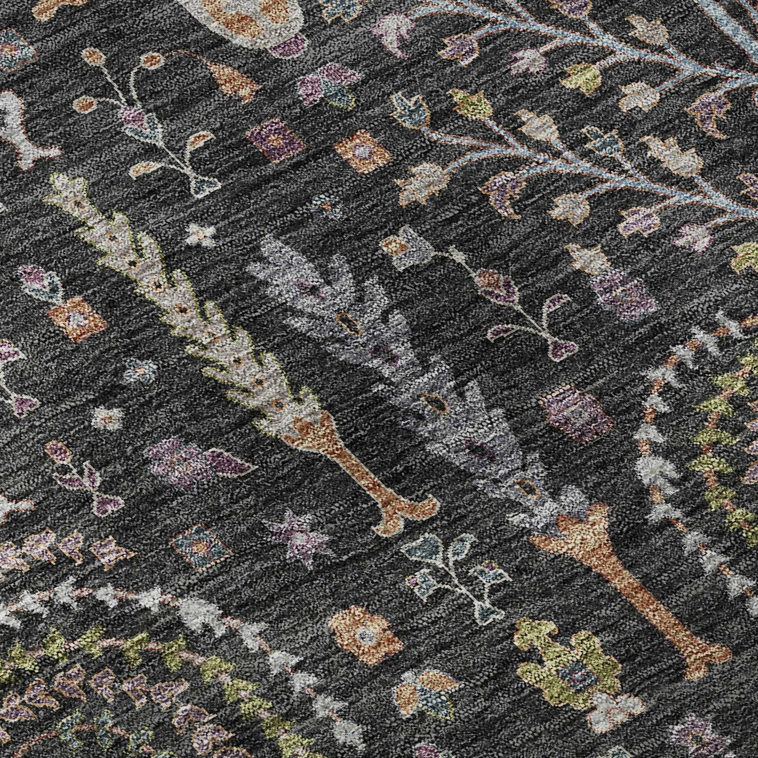 A rectangular traditional area rug with a deep charcoal-black ground covering the majority of the surface. The field is densely filled with an allover botanical garden pattern featuring stylized weeping trees, flowering urns on pedestals, delicate branching stems, and small floral blooms rendered in soft sage green, warm burnt orange, dusty pink, silvery gray, ivory white, and muted gold. The motifs are arranged in a symmetrical, repeating layout typical of Persian garden-style rugs. A multi-layered ornate border frames the entire composition, featuring the same botanical and floral elements on a slightly lighter dark ground with thin geometric guard stripes in muted tones. The pile appears smooth and medium-height with a machine-woven surface texture. Edges are cleanly bound with no fringe or tassels. The overall impression is of a rich, jewel-toned heirloom rug with a moody, dramatic palette.