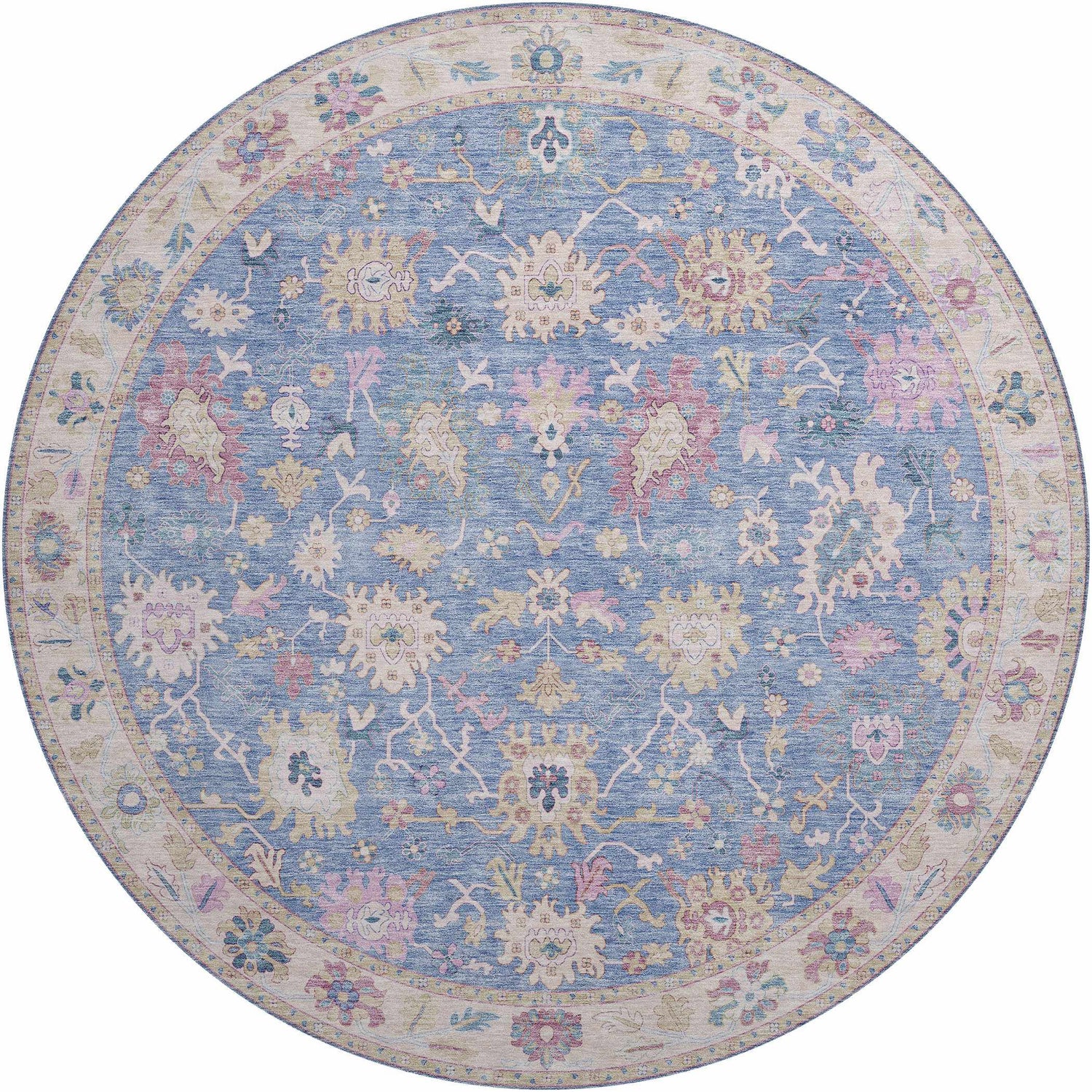 A vibrant blue Oushak-style floral rug that's fully washable and outdoor-safe — traditional beauty that actually handles real life.