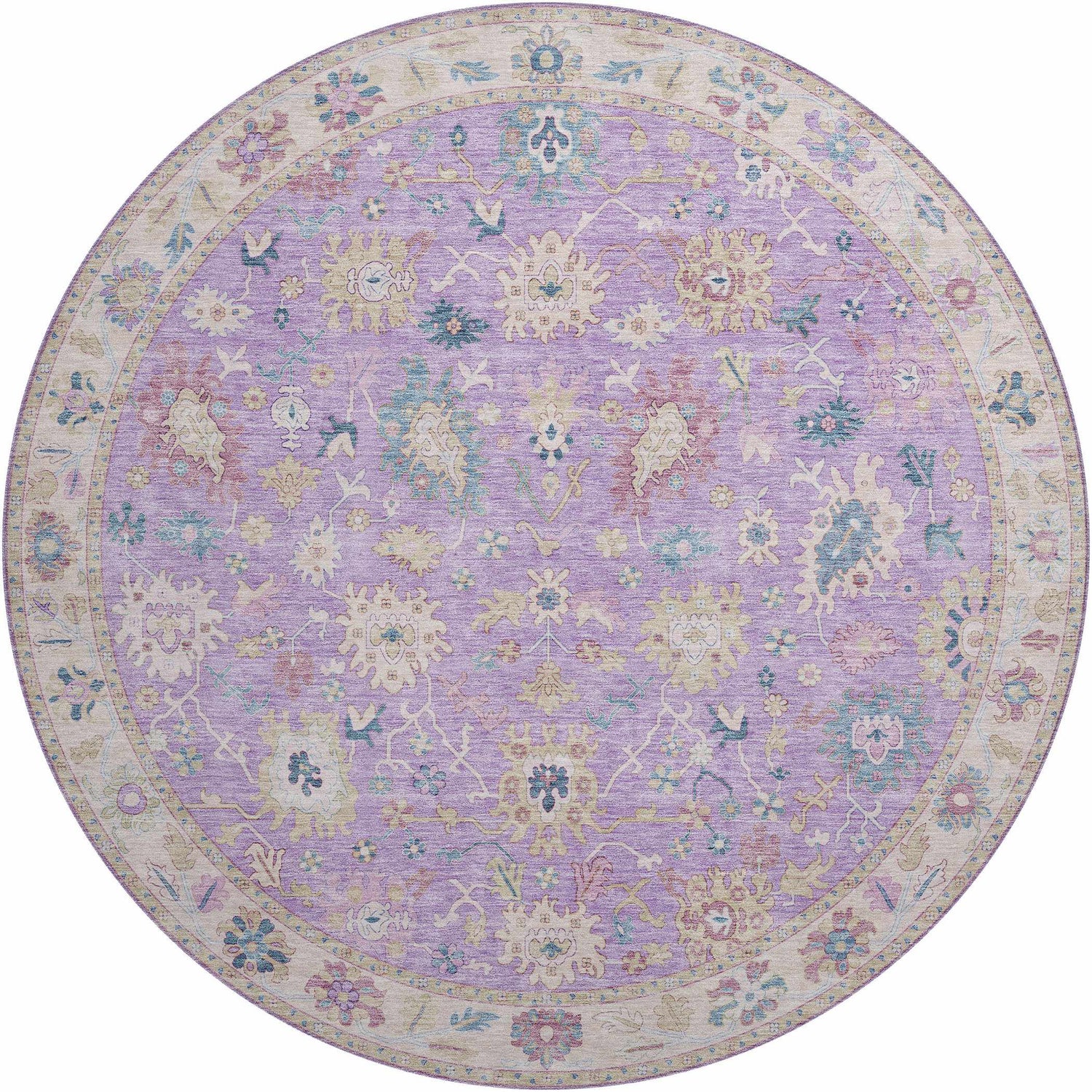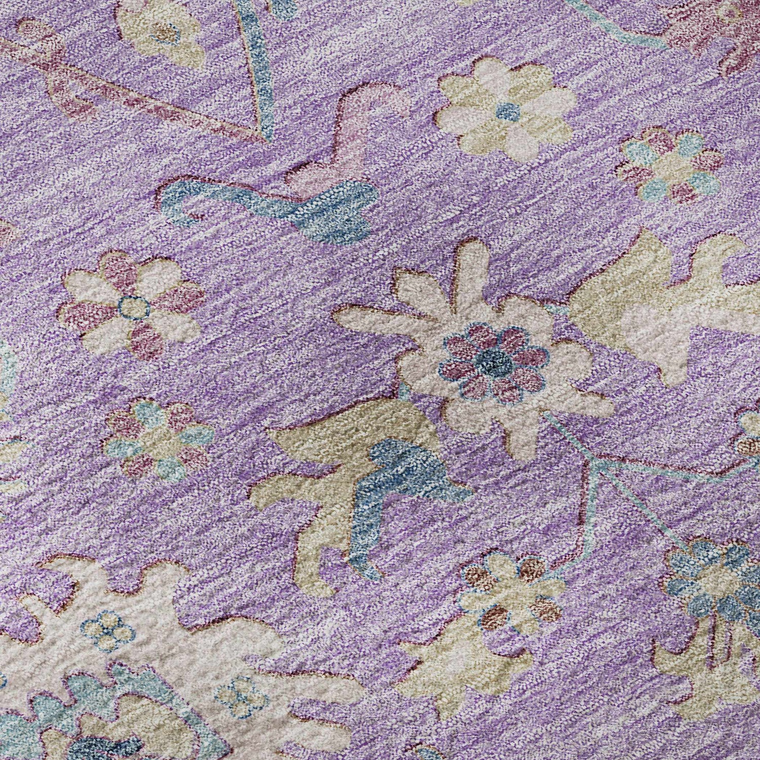 A vibrant purple oushak-style rug with allover floral medallions and a cream border — fully washable and outdoor-safe for effortless beauty anywhere.