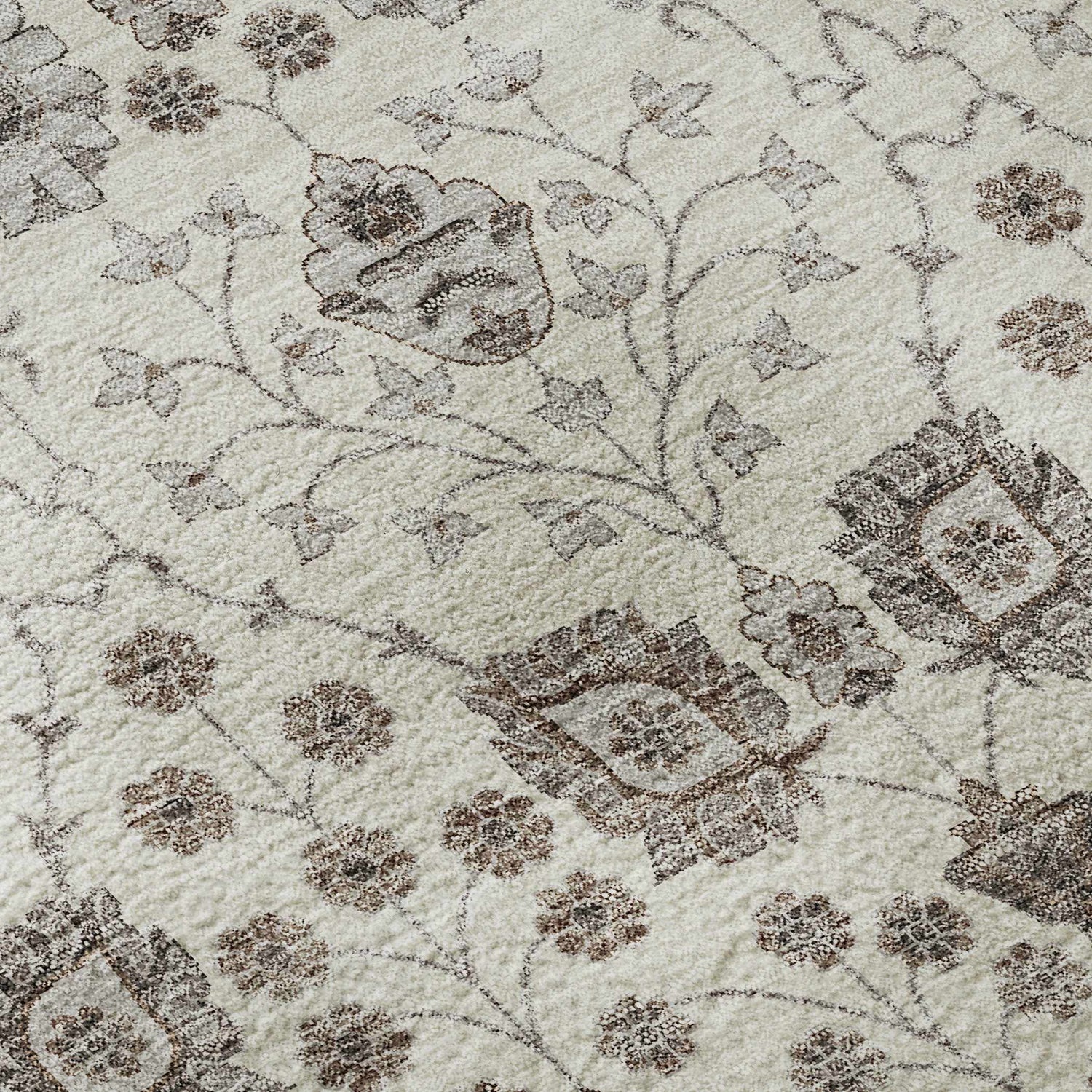 neutral paletteA soft ivory base dominates the field, with the intricate floral and vine motifs rendered in layered shades of gray and taupe — creating a quietly sophisticated, neutral palette that reads as warm without being yellow.