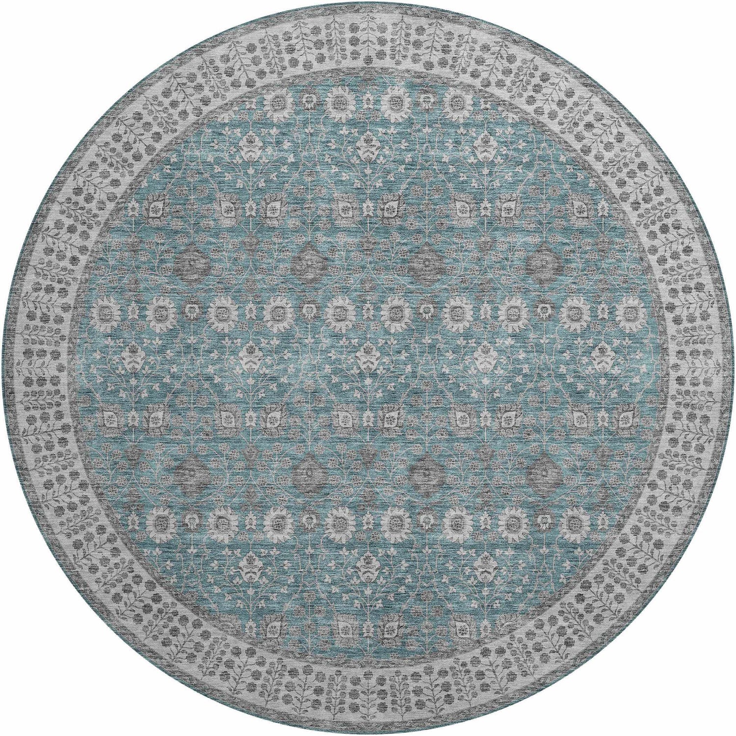 cool paletteA vibrant teal dominates the field, layered with faded ivory and soft gray floral motifs that give it an antique, sun-washed quality — the gray and white border grounds the palette with cool, sophisticated contrast.
