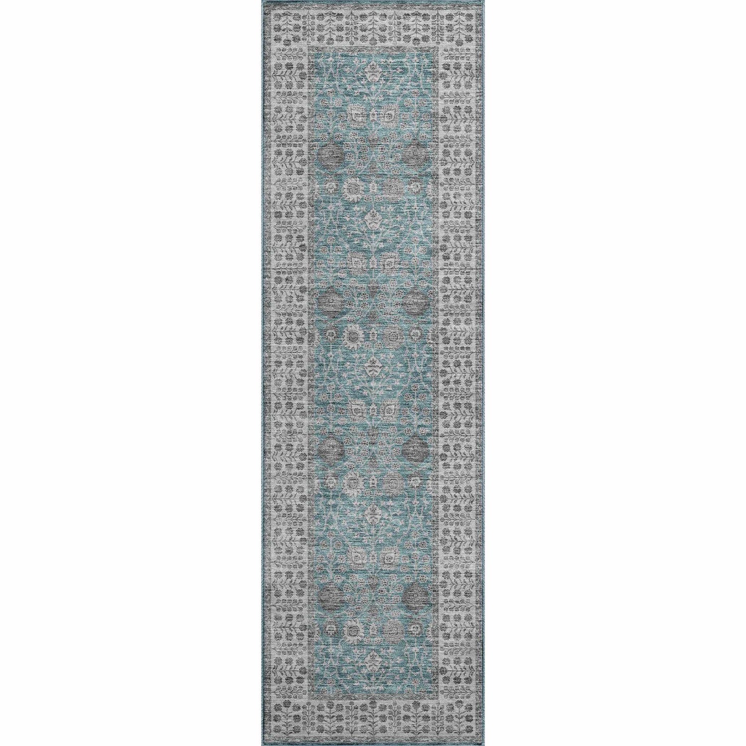 A rectangular area rug with a rich teal/turquoise field covered in an allover traditional Persian floral and botanical pattern rendered in faded ivory, soft gray, and white — the motifs include scrolling vines, stylized flowers, and small medallion-like accents distributed evenly across the surface. The rug features a wide, structured gray and white border filled with repeating small floral and leaf motifs arranged in neat rows, giving it a formal, layered frame. The overall finish has a slightly distressed, antiqued quality — colors appear softly faded rather than saturated flat, adding depth and vintage character. The pile is medium height with a smooth, machine-woven surface texture. Edges are cleanly bound with no fringe or tassels. The overall impression is a classic Persian-style rug in a fresh, cool teal colorway.