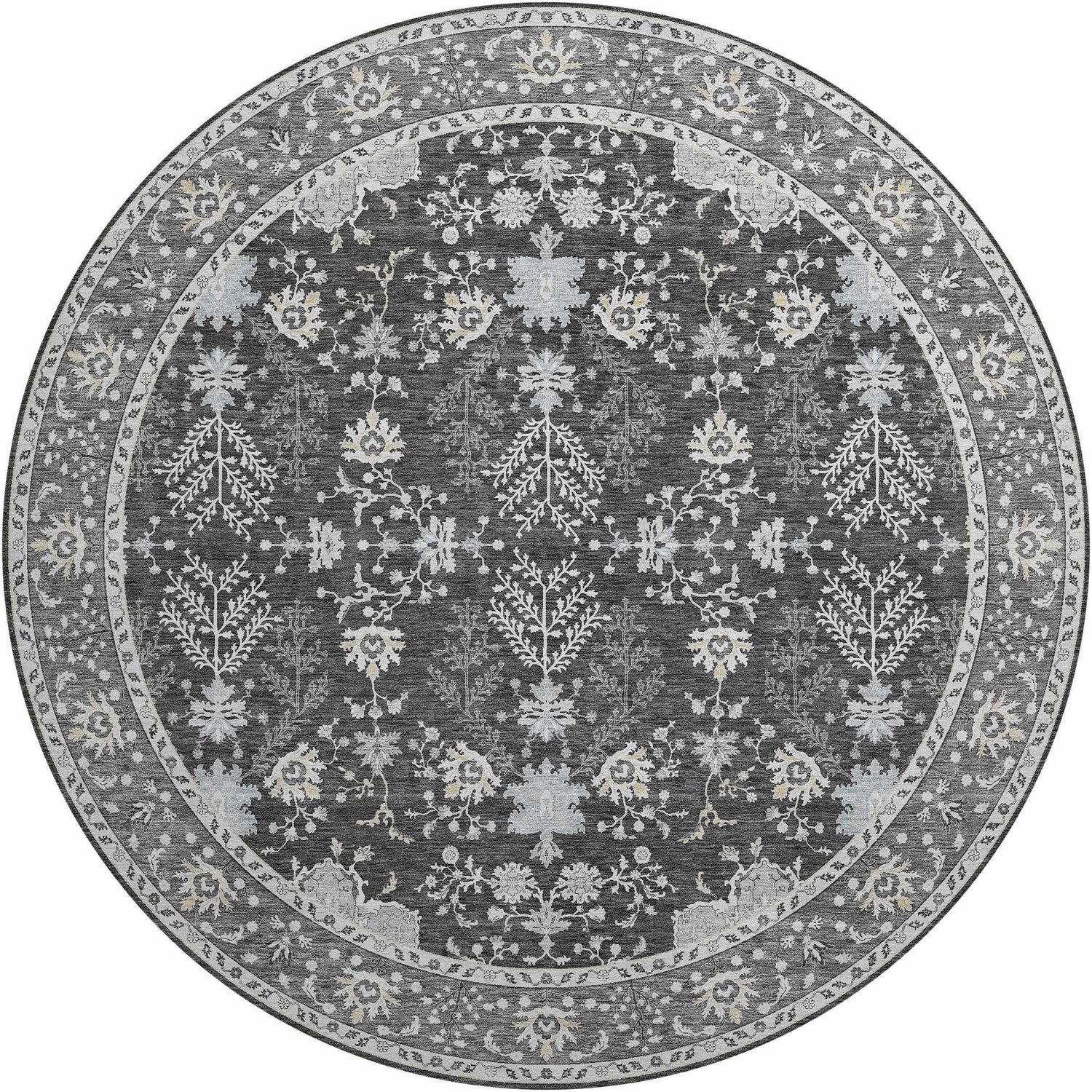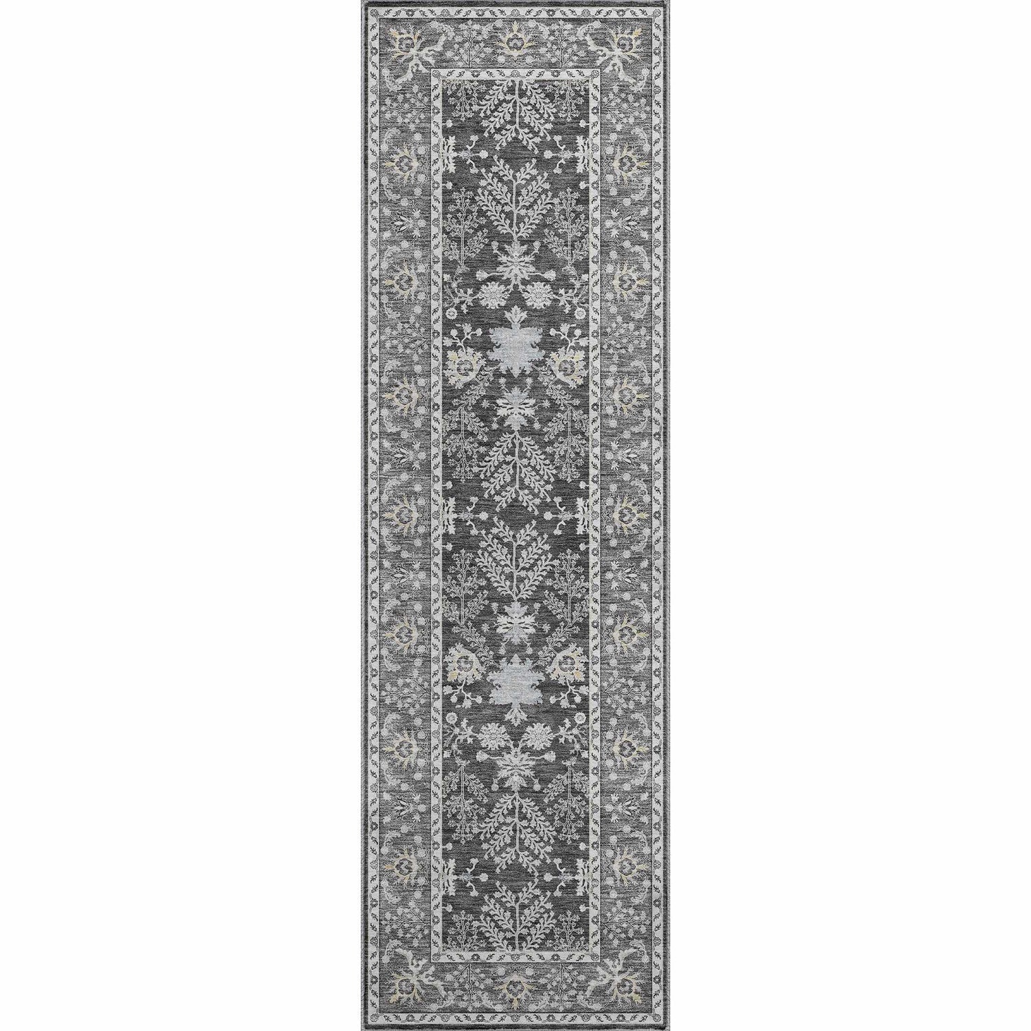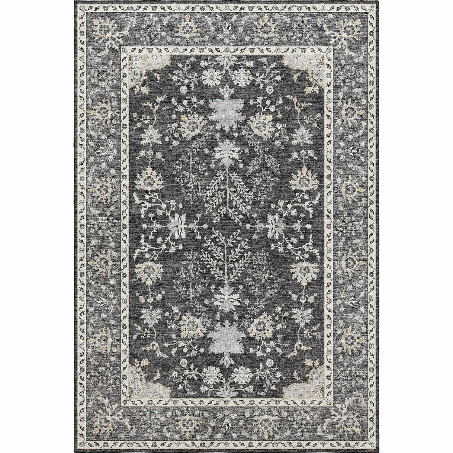 A stunning charcoal Persian-style floral rug that's fully machine washable and outdoor safe — traditional elegance that actually handles real life.