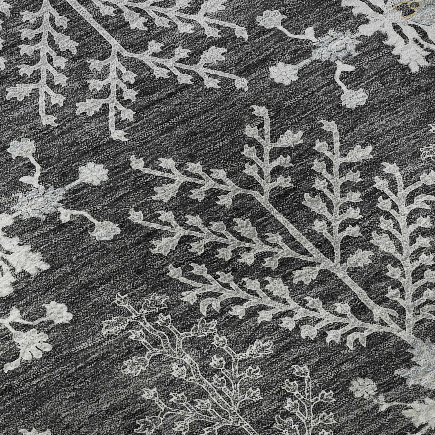 cool paletteA rich, moody charcoal dominates the field, with soft gray and cream floral and botanical details woven throughout — the overall palette feels sophisticated and grounded, with just enough contrast to make the intricate pattern pop without feeling busy.
