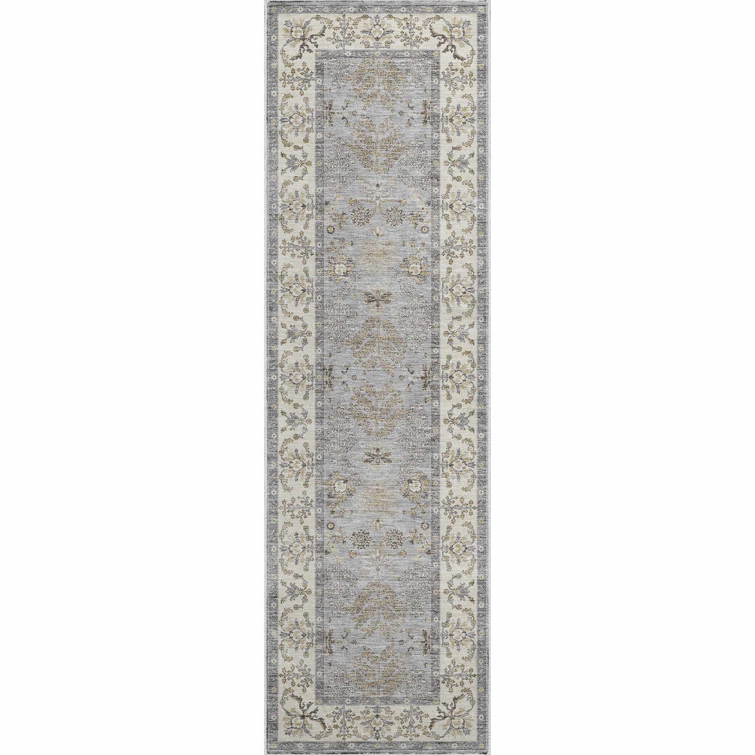 A classic Persian-inspired floral design in cool gray and cream — fully washable, outdoor safe, and built for everyday life without sacrificing elegance.
