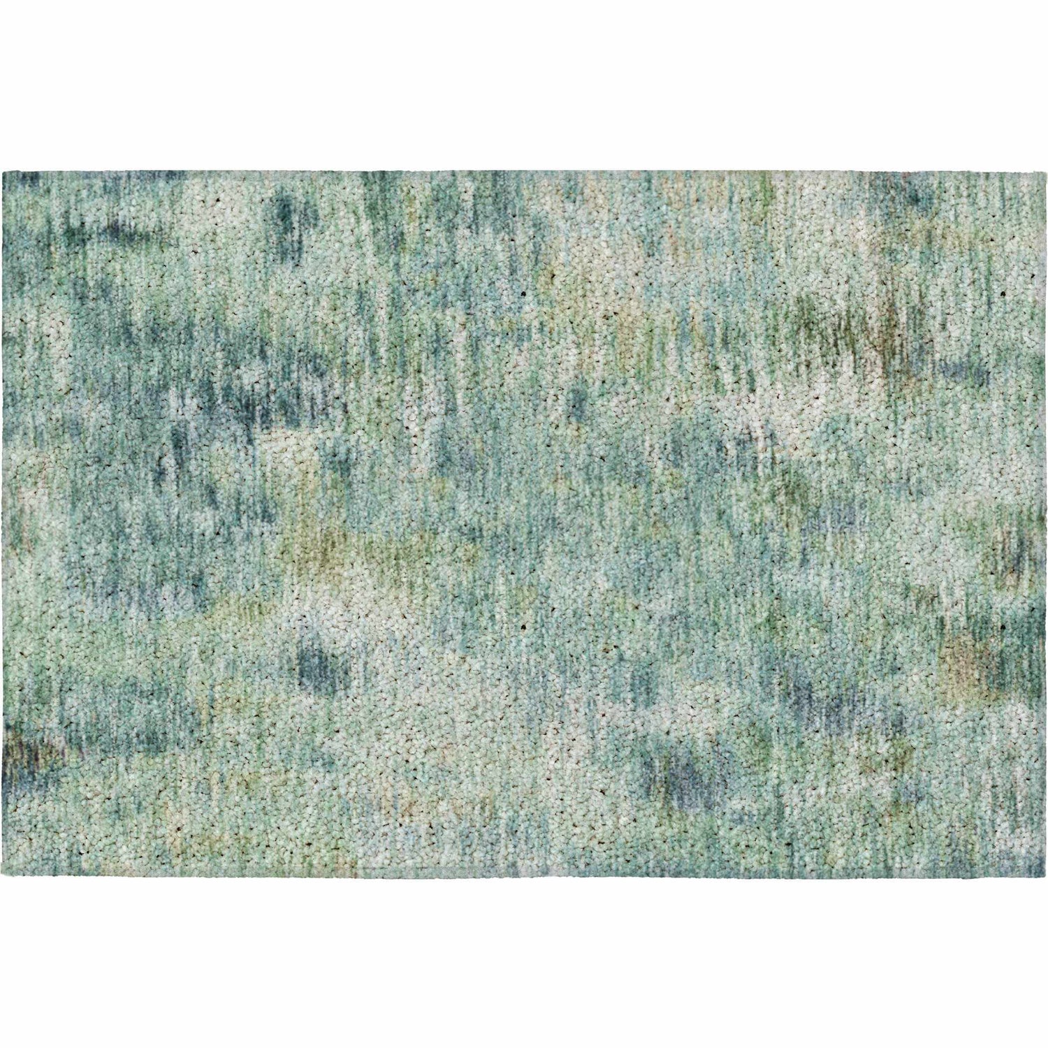 A rectangular area rug with an allover abstract watercolor-style pattern in a blended palette of teal, sage green, dusty blue, and soft white. The colors flow organically across the surface with no defined repeat — darker teal and blue tones pool in irregular patches while lighter aqua and white areas create a faded, sun-washed effect. The pile is medium-high with a slightly textured, dense surface that catches light subtly. Edges are cleanly bound with no fringe or tassels. The overall impression is of a modern abstract painting rendered in textile — calm, fluid, and sophisticated.