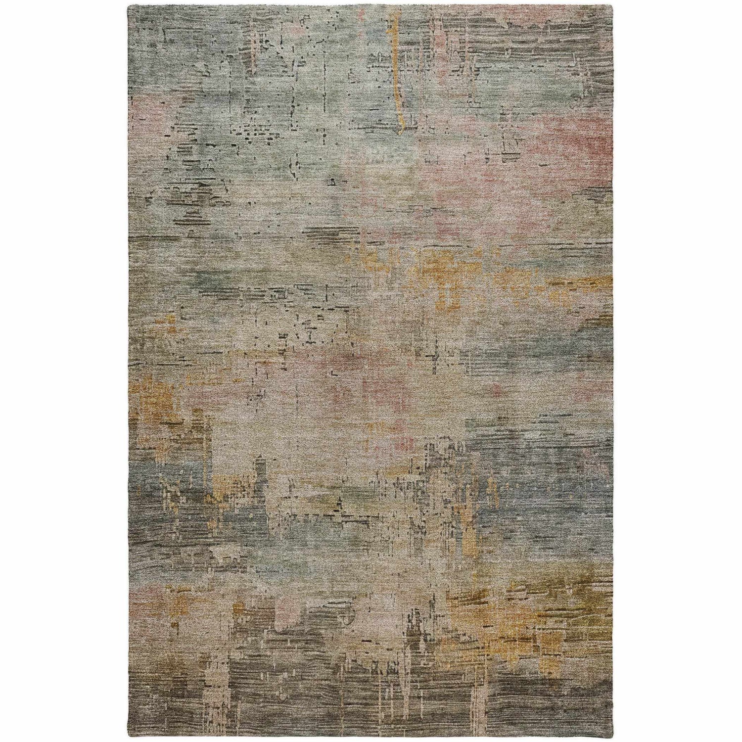 A painterly abstract rug in earthy grays, pinks, and mustard — high pile, rubber-backed, and built for indoor and outdoor use.
