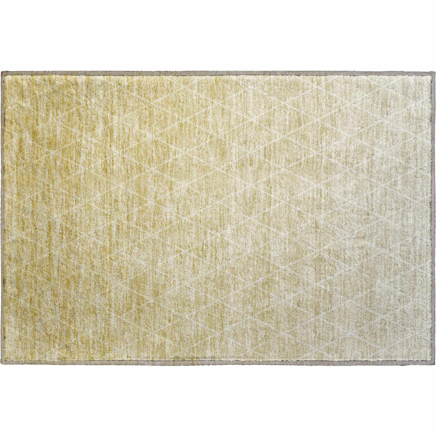 warm paletteA warm golden wheat dominates the left side of the rug, gradually softening into sandy beige and cream toward the right, creating a subtle ombre effect. Thin white geometric lines trace the diamond trellis pattern across the surface, while a slim gray border frames the whole composition.